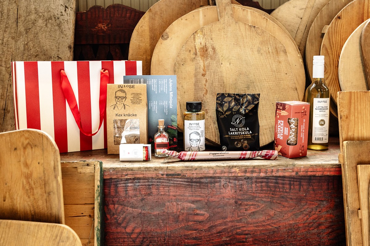 Setet innehåller: 1 st röd/vit randig påse med röda sidenhandtag 1 st äppleglögg 50 cl 1 st grovkorning senap 265 ml 1 st pepparkakor Nyåkers 150 g 1 st polkagris med smak av pepparkaka 1 st förpackning med kexknäcke 150 g 1 st glasflaska med tändstickor 1 st ask med refill tändstickor 1 st påse med salt kola lakrits från Narr 120 g 1 st kort med julquiz.
