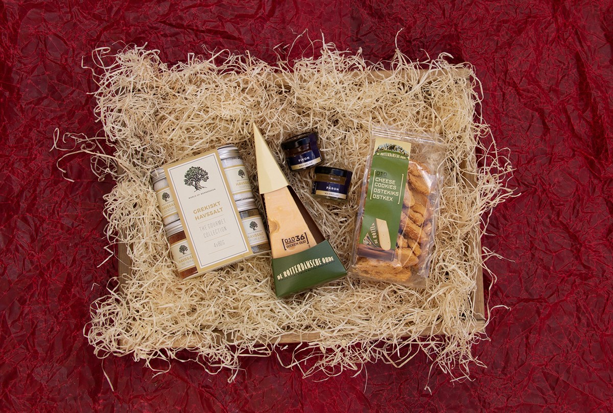 I lådan hittar vi något som passar alla. Old Rotterdam som är en långlagrad hårdost med unik smak, passar utmärkt tillsammans med två delikatessmarmelader och krispiga ostkexen. Detta kombineras med fyra olika havssalt, naturligt utvunna från Grekland – fyra varianter med brett användningsområde i burkar som är lika snygga på bordet som vid spisen. Innehåll: Old Rotterdam 300 g, Old Rotterdam kex 125 g, WOW salt 320 g, päronmarmelad 28 g och fikonmarmelad 28 g.