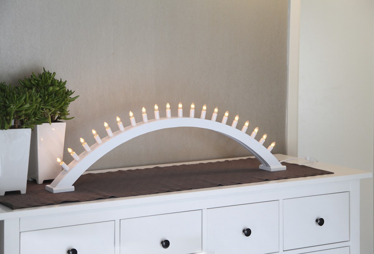 Vit träljusstake med 20 ljuskällor. Ljusstaken är formad som en båge och ger ett elegant intryck. En underbar adventsljusstake som sprider härlig julstämning i hemmet. BxH: 105x31 cm.
