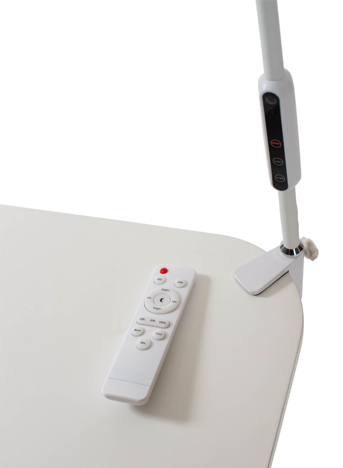 Lampans långa arm gör det enkelt att positionera ljuset där man önskar. Dimmerfunktion, färgtemperaturjustering och automatisk avstängning. Hanteras via touchkontroll eller via den medföljande fjärrkontrollen. 9 W LED. Längd: 1130 mm.