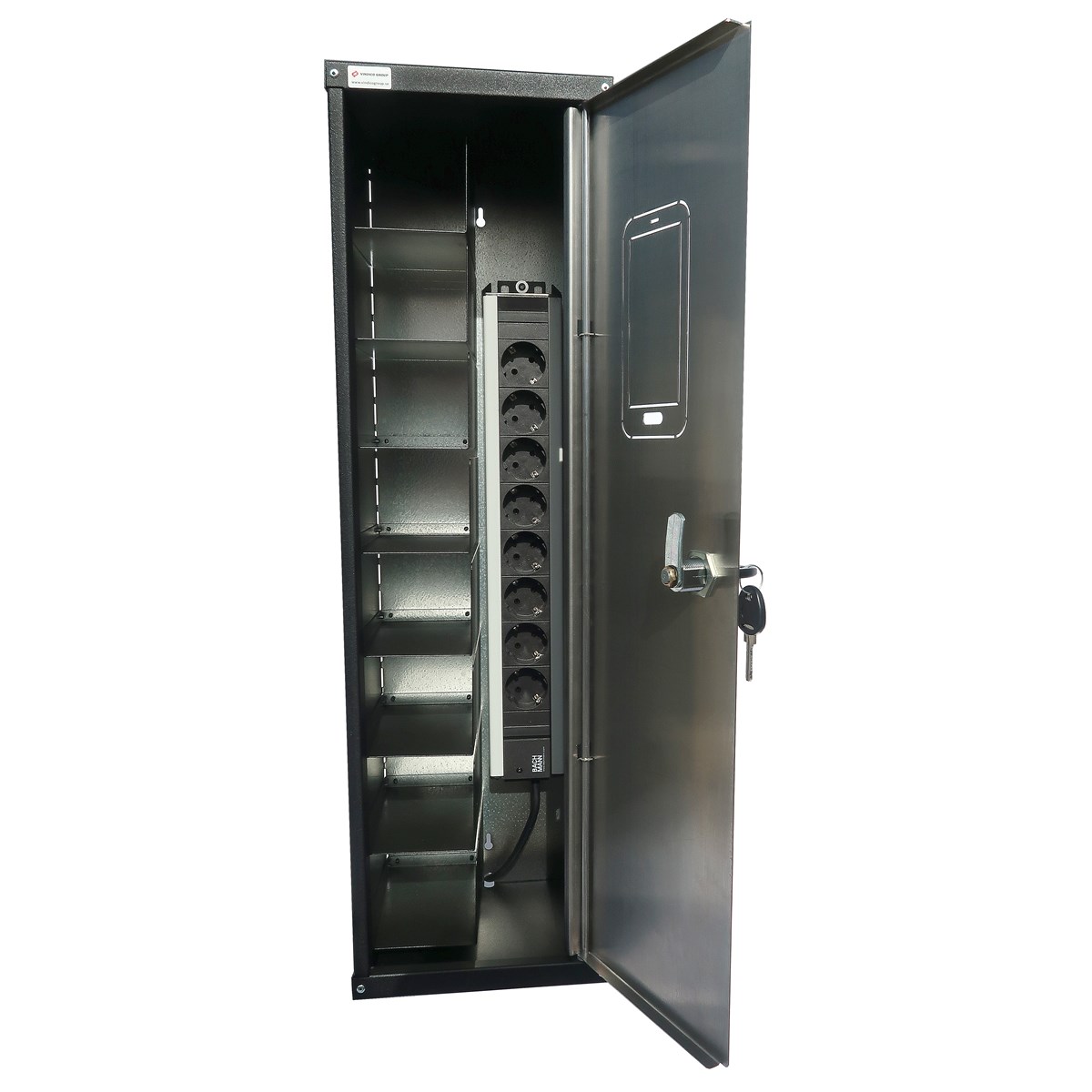 Mobiltelefonskåp med åtta rymliga fack. Skåpet är uppdelat i två sektioner, en där laddarna placeras och en med hyllor där telefonerna placeras. Använder telefonernas egna laddare. Finns i två varianter, med en eller åtta luckor. Den med åtta luckor ger användaren ett eget fack och den med en lucka ger tillgång till alla facken för alla med nyckel. Mått (B x H x D): 205 x 700 x 195 mm. Frakt tillkommer, kontakta oss för prisuppgift.