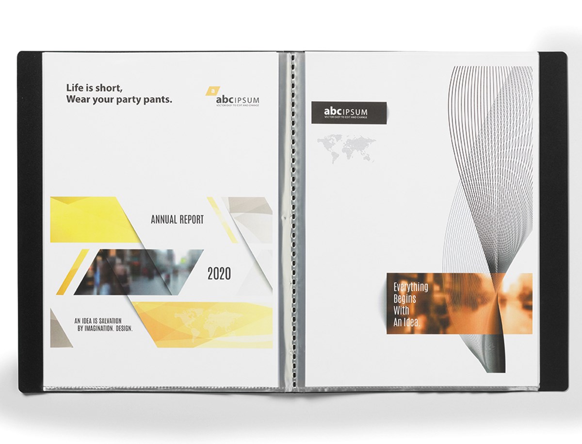 Demonstrations- och presentationspärm i polypropylen med fastsvetsade kopiesäkra fickor för A4. Istoppsficka på ryggen med instick för uppmärkning. Svart.