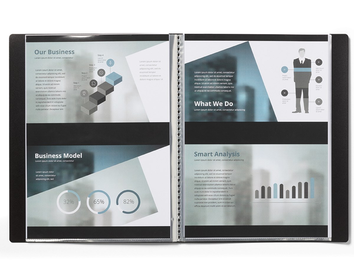 Demonstrations- och presentationspärm i polypropylen med fastsvetsade kopiesäkra fickor för A4. Istoppsficka på framsida och rygg för egen framsida och uppmärkning av ryggen. Svart.