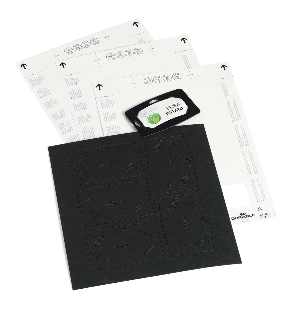 20 st namnskyltar samt 3 utskrivbara badgemarker A4-ark med insticksetiketter medföljer. Använd gratisprogrammet DURAPRINT® som finns på www.duraprint.se för att skapa och skriva ut snygga namnetiketter.