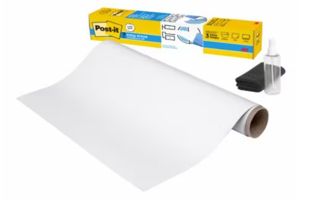 Post-it® Easy Erase Whiteboard förvandlar snabbt vilken slät yta som helst till en funktionell whiteboard. Rulla ut, klipp till önskad storlek, ta bort skyddsfilmen och fäst på väggen, glas eller annan slät yta.
