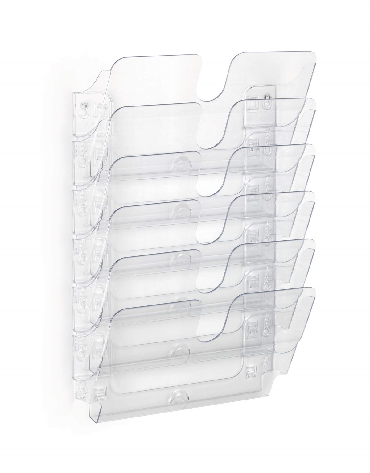 Blankettfack, broschyrställ, postfack - FLEXIPLUS är en serie med platsbesparande, flexibla och väggmonterade hållare för broschyrer, tidskrifter, blanketter och annan information i A4-format. Varje fack har en kapacitet på 24 mm tjocka buntar. Detta är ett komplett set med 6 fack i liggande format där facken kan monteras ihop eller användas var för sig.