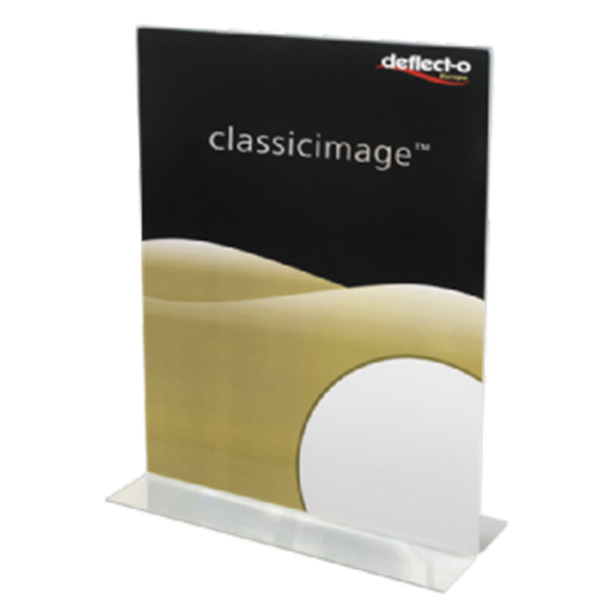 Praktiskt bordsställ i transparent polystyren med T-fot. Stället presenterar menyer, prislistor, reklambudskap, fotografier eller annan information på ett tydligt och stilrent sätt. Tack vare den dubbelsidiga läsbarheten passar det särskilt bra på bord och andra ytor där informationen ska synas från båda håll.