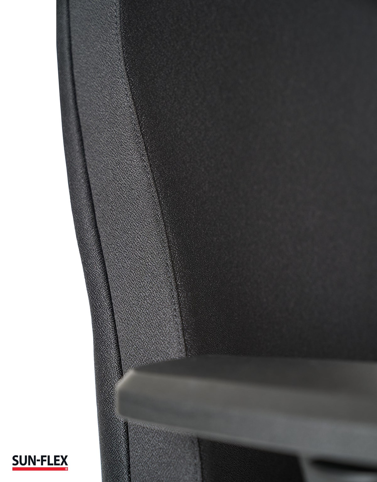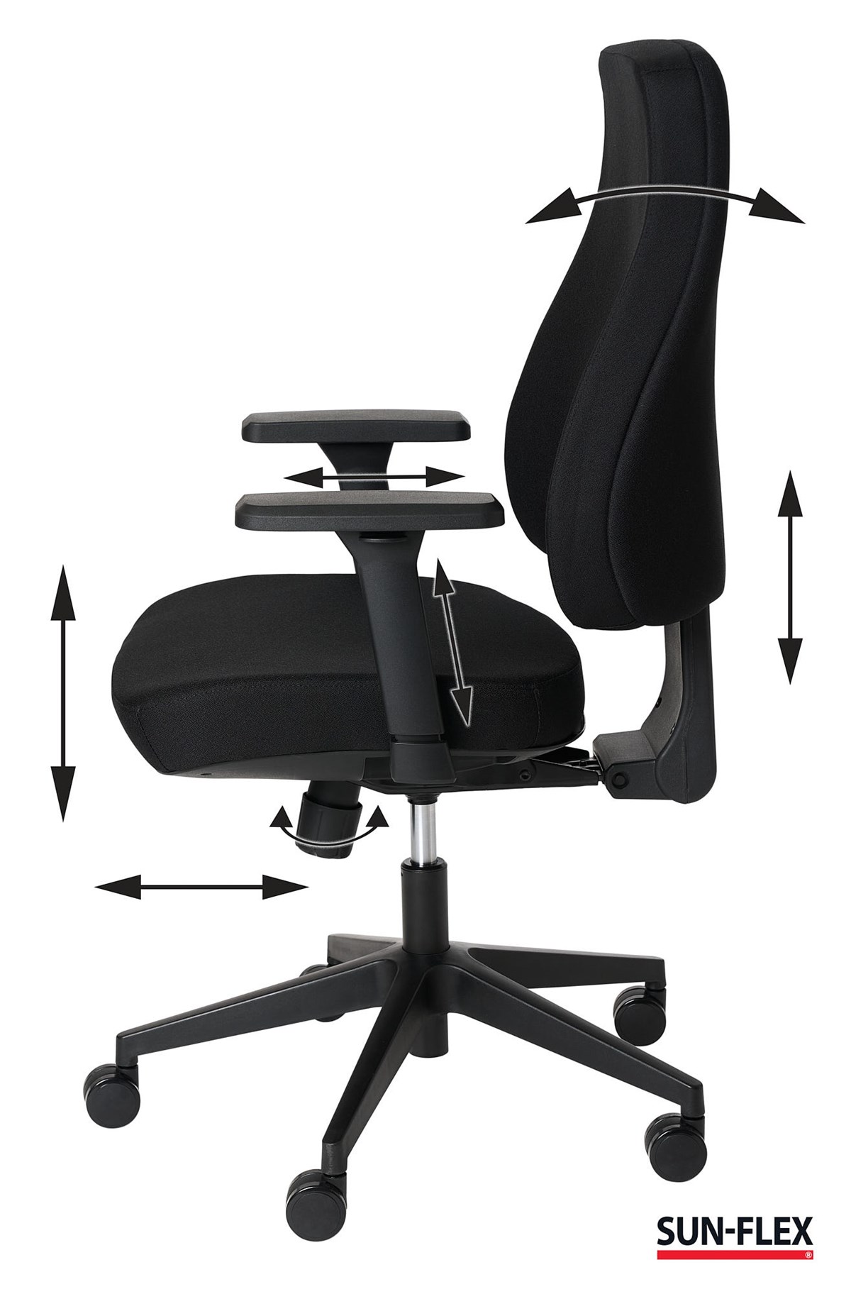 Det stödjande, kraftiga, justerbara och mjuka ryggstödet erbjuder en fullkontaktsrygg med överlägsen komfort och ergonomi. Det ger stöd längs hela ryggen, från ländrygg upp till bröstrygg, vilket bidrar till minskad belastning på ryggraden och främjar en naturlig sittställning. Genom att stödja hela ryggen säkerställer ryggstödet en jämn fördelning av tryck och avlastar musklerna, vilket minskar risken för ryggsmärtor och stelhet. Den mjuka och samtidigt stödjande sitsen, säkerställer komfort, främjar korrekt sittställning, minskar trötthet, förbättrar produktivitet och kan förebygga hälsoproblem. Valfrihet och möjlighet till individuell anpassning är centrala egenskaper, och med SUN-FLEX®OFFICECHAIR MB kan du enkelt och intuitivt justera stolen efter dina personliga behov. Den erbjuder höjdjusterbart ryggstöd, öppen eller låst gunga, sitsdjupjustering samt 4D-armstöd.