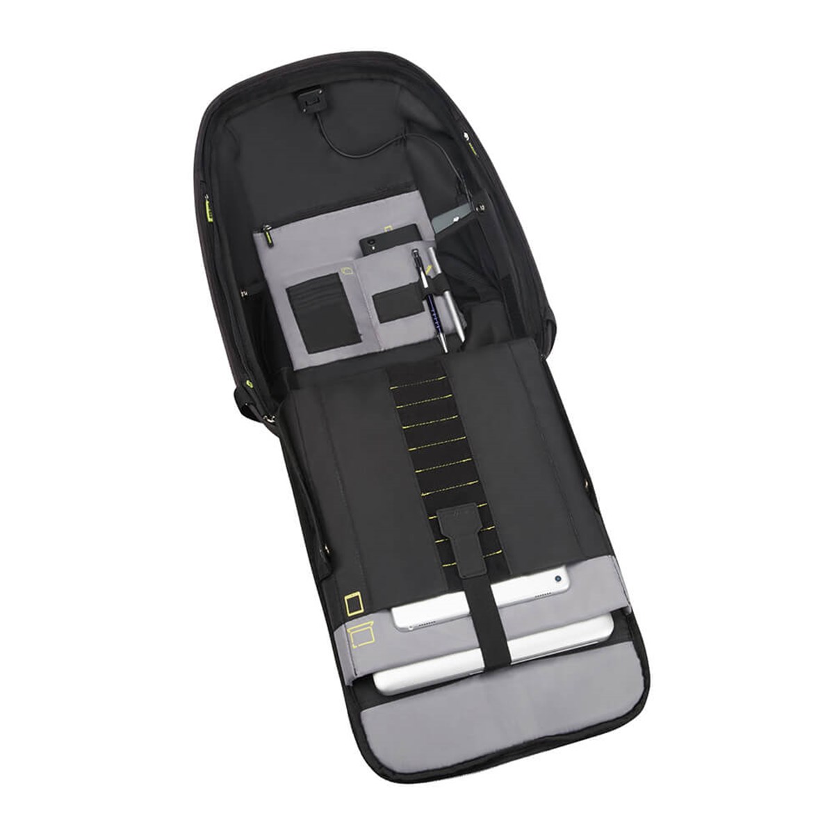 Ryggsäck med många säkerhetsegenskaper, det stora facket kommer man endast åt bakifrån, sidofack med integrerad RFID-skydd och ett ekologiskt skärresistent material som skyddar extra mot att ryggsäcken blir uppskuren. Tyget hos denna väska är tillverkat av ekologisk Recyclex, ett tyg skapat med hjälp av 100% återvunna PET-flaskor. Reflekterande detaljer. USB-port. Datorstorlek: 15,6". Material: polyeten. Mått: 44 x 30 x 16 cm.