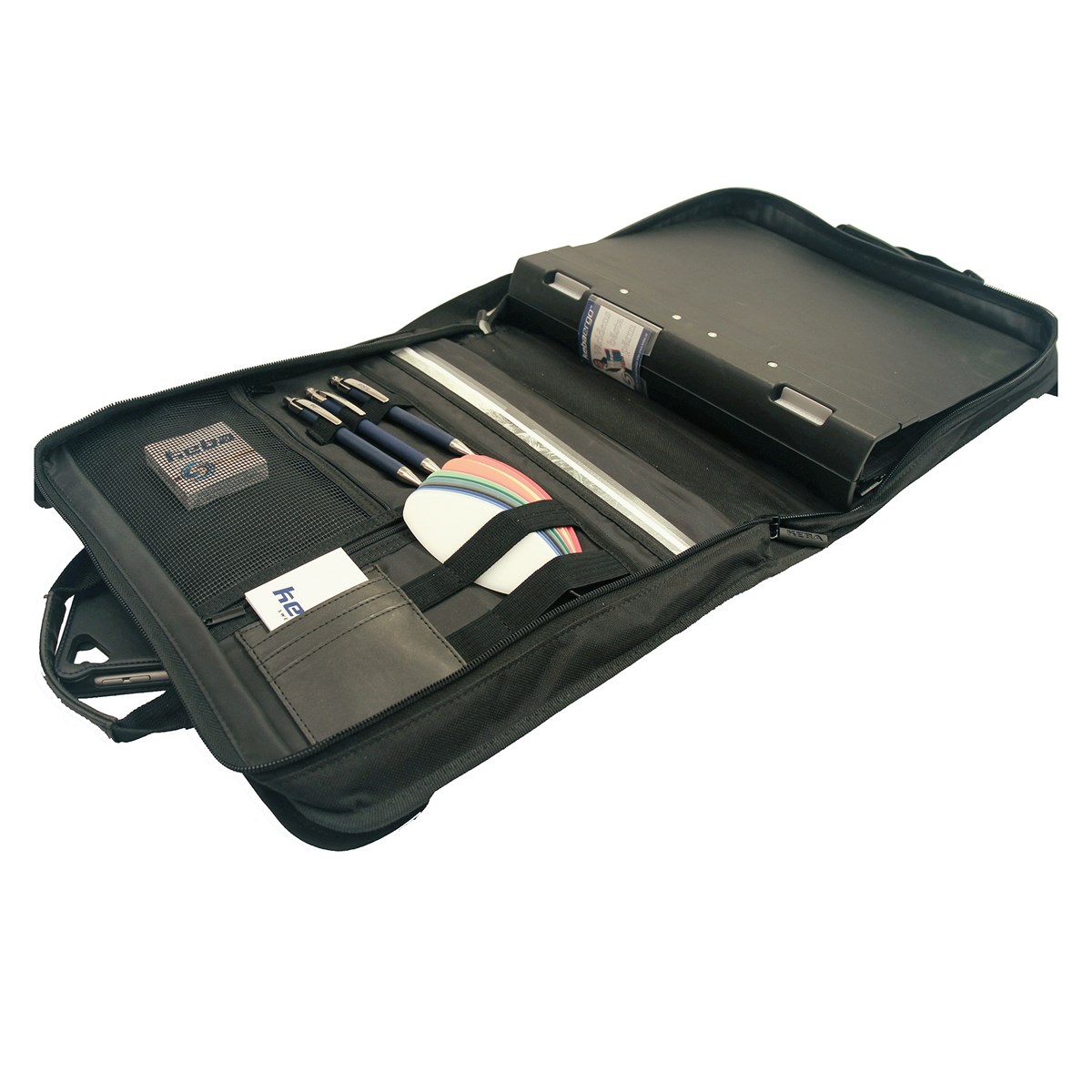 Kraftig väska i slitstark nylon inklusive pärm som enkelt kan tas ur och i. Kan bäras under armen, med inbyggda bärhandtag eller med medföljande axelrem. Plats för visitkort, kalkylator, kollegieblock, pennor m.m. 5 års garanti.
