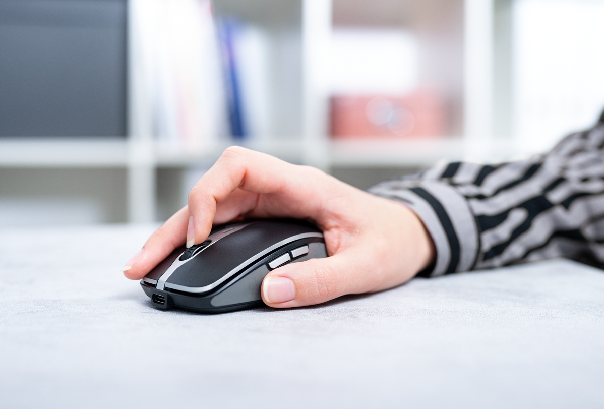 Kompakt trådlös mus med laddningsfunktion och två-i-ett-drift. Med sina sidopaneler i gummi och sin kompakta form ligger den trådlösa datormusen CHERRY MW 9100 perfekt i handen. Genom att trycka på DPI-knappen kan du justera till en hög upplösning på upp till 2 400 dpi i 3 steg: 1 000, 1 600 eller 2 400 dpi. Det inbyggda litiumbatteriet laddas med den medföljande USB-C-kabeln även när musen används. En laddning kan vara i flera veckor. Den tvåfärgade statuslampan ger information om batteristatus, laddningsstatus, anslutningsstatus eller aktuell upplösning. För maximal flexibilitet kan du ansluta CHERRY MW 9100 utan sladd antingen via Bluetooth® eller med den medföljande 2,4 GHz trådlösa USB-mottagaren. Du kan växla mellan dessa anslutningstyper med hjälp av en skjutreglage på undersidan av musen. Du kan till exempel ansluta en bärbar dator via Bluetooth® och en dator via USB-dongeln. Nu kan du styra båda enheterna med samma mus.