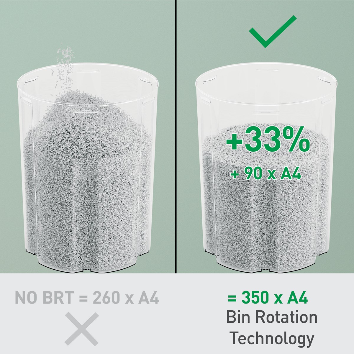 Med unik Bin RotationTechnology (BRT), som effektivt maximerar behållarkapaciteten med +33%*. Den roterande behållaren säkerställer en plan och jämn pappersfördelning, förhindrar att det bildas toppar och gör att ytterligare 90x A4-ark kan strimlas innan den töms. Tack vare BRT behöver du inte skaka eller ta bort behållaren manuellt - indikatorn för "full behållare" aktiveras först vid 100% kapacitet. Med en generös 22 liters behållare som rymmer upp till 350 x A4-ark garanterar denna dokumentförstörare färre avbrott.