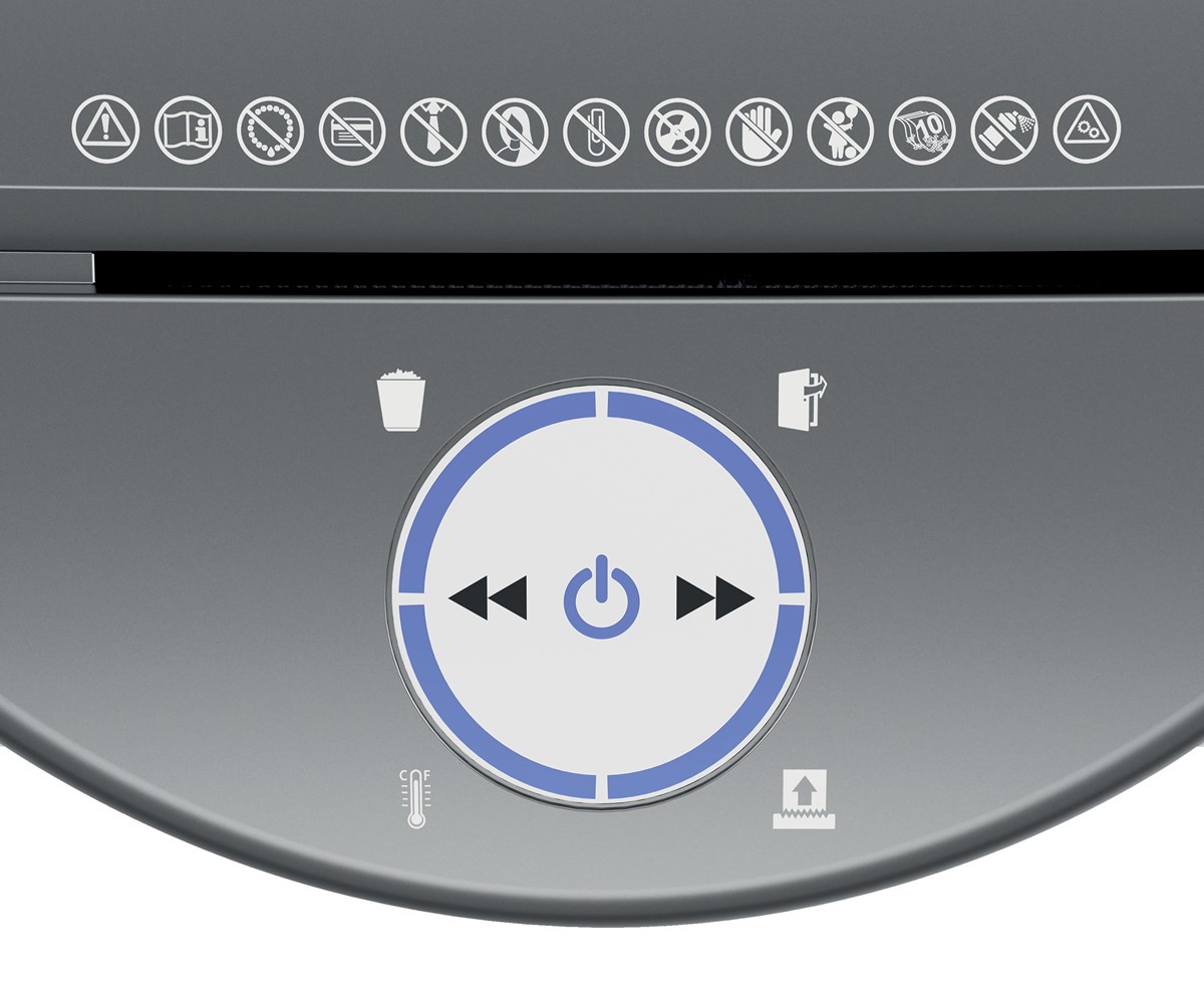 Den upplysta blå behållaren och den intuitiva roterande LED-displayen ger tydliga och lättförståeliga varningar, t.ex. om behållaren är full och dörren öppen, vilket gör strimlingen enkel och effektiv. Leitz IQ OptiMax 350 dokumentförstörare är konstruerad för moderna arbetsytor och är särskilt utformad för små kontor, med extremt tyst drift som minimerar buller - perfekt för delade miljöer.