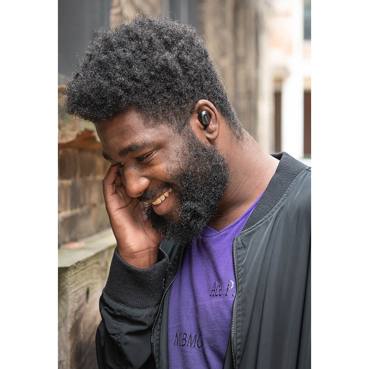 Trådlösa in-ear stereohörlurar med högupplöst ljud. Bluetooth 5.0 med en räckvidd på 10 meter. Laddningsfodral, USB-C-kabel och silikonproppar (små, medel och stora). 4,5 timmars speltid. Auto-pairing.