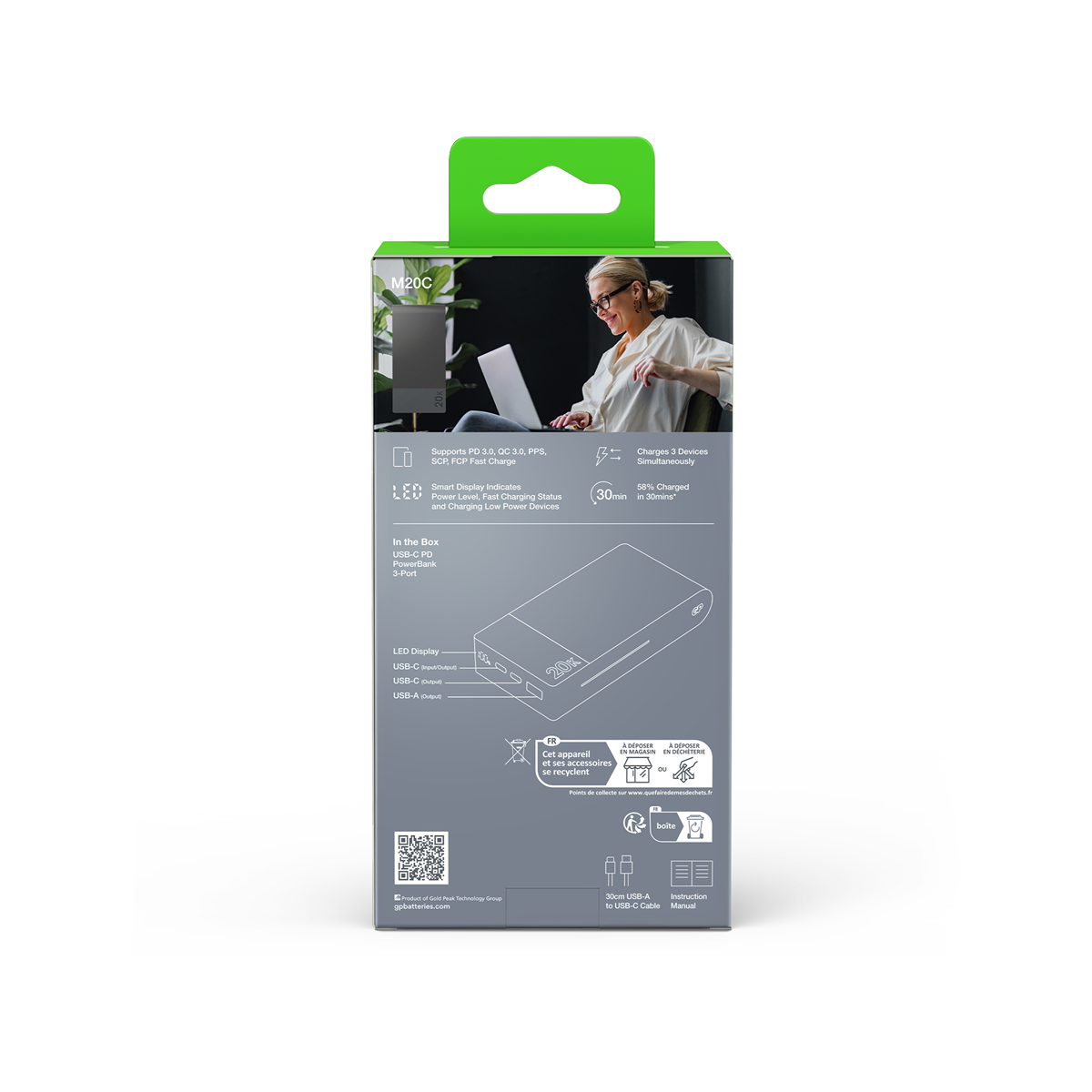 M2+ PowerBank laddar din telefon till mer än 58% på bara 30 minuter! En fulladdad M2+ Powerbank räcker till fyra laddningar för din smartphone. Den tydliga batterinivåindikatorn i procent visar återstående batteri. Med sina sex olika säkerhetsfunktioner och sin robusta konstruktion kommer denna powerbank bli din bästa sidekick för många år framåt. 1 x USB-A och 2 x USB-C samt 6 inbyggnada säkerhetsfunktioner. 2x USB-C 1x USB-A.