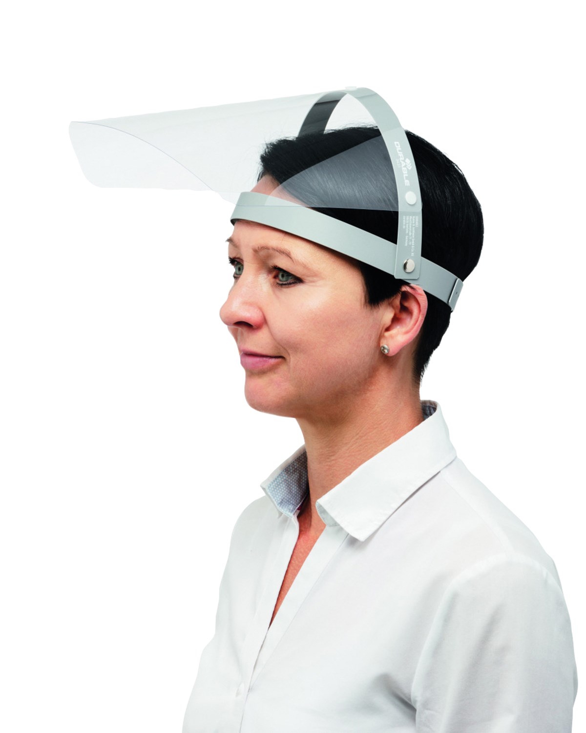 CE-märkt skyddsvisir för ansiktet. Med vadderat pannband för komfort och avtagbart visir som kan desinficeras och bytas ut. Optisk klass 1 – den högsta nivån av visuell klarhet tack vare en mycket transparent polykarbonat. Visiret kan fällas upp (t.ex. när du ska arbeta vid datorn). Passar huvuden med en omkrets mellan 53–62 cm. Extra skärmar för utbyte finns.