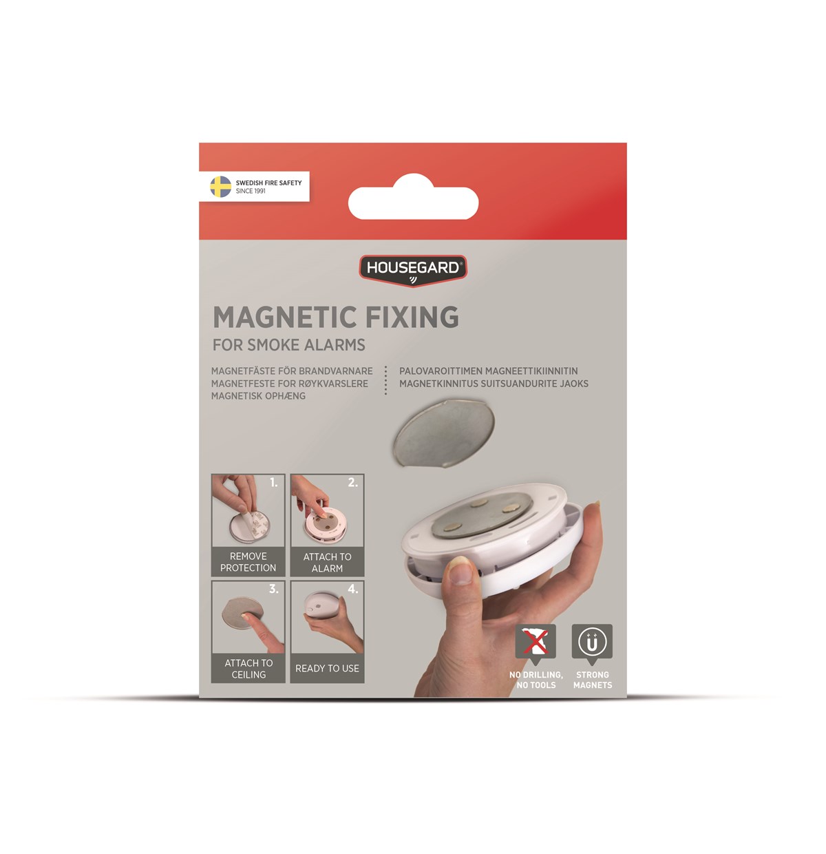 För dig som inte vill, kan eller får borra i taket. Innehåller två magnetplattor med självhäftande tejp som fästes i taket och på brandvarnaren. Passar varnare med en diameter på minst 60 mm.