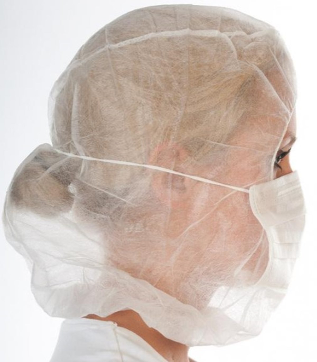 Hår- och munskydd i ett, i polypropylen non-woven.