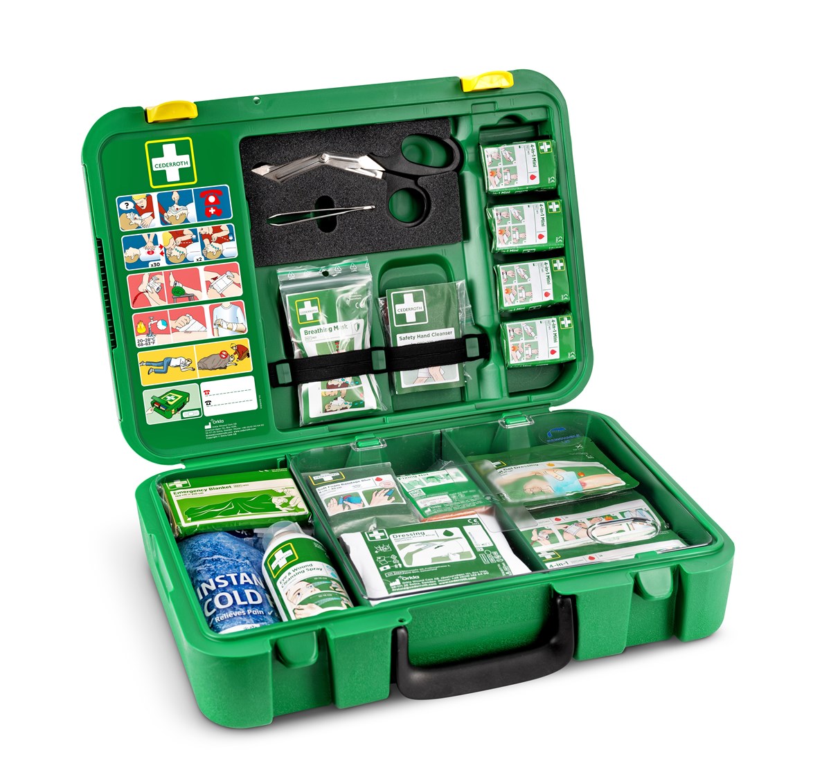 Innehåll: - 3 Cederroth 4-i-1 blodstoppare - 4 Cederroth 4-i-1 mini blodstoppare - 45 Salvequick Plastplåster - 40 Salvequick Textilplåster - 10 Salvequick Sårtvättare - 2 Soft Foam Bandage 6 cm x 40 cm - 1 Andningsmask - 4 Safety Hand Cleanser - 4 par handskar - 1 Räddningsfilt - 2 Elastiska bindor - 3 Metalliserade kompresser 20x40 cm 2 Fästnät - 2 Cederroth Burn Gel Dressing - 1 Salvequick Cold Pack - 1 Eye & Wound Cleansing Spray - 1 Sax - 1 Pincett - 1 Första Hjälpen-instruktion