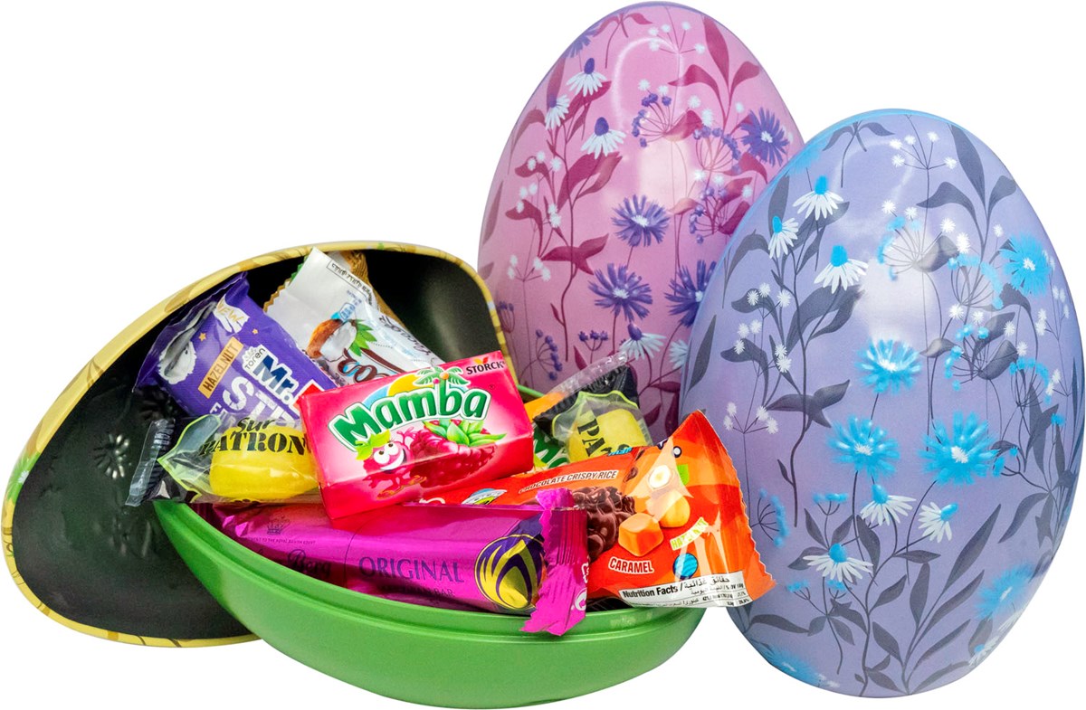Plåtägg med motiv i härliga påskfärger. Fyllda med välkänt godis. Mått 16 x 11 cm. Vikt 236 g.