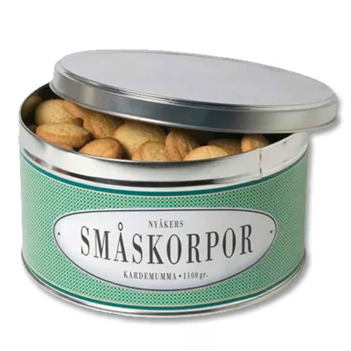 Småskorpor i generös plåtburk. Smaksatta med en aningens kardemumma. En smak av tradition. Nyåkers kakor och småbröd bakas på samma sätt som de alltid har gjorts – hemma i Västerbotten. Vi tycker att det blir bäst så. Låt dig väl smaka. Fria från palmolja. Vikt: 1100 g.