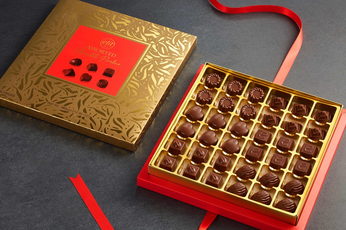 En röd och gyllene chokladask med rosett, innehållande goda chokladpraliner.