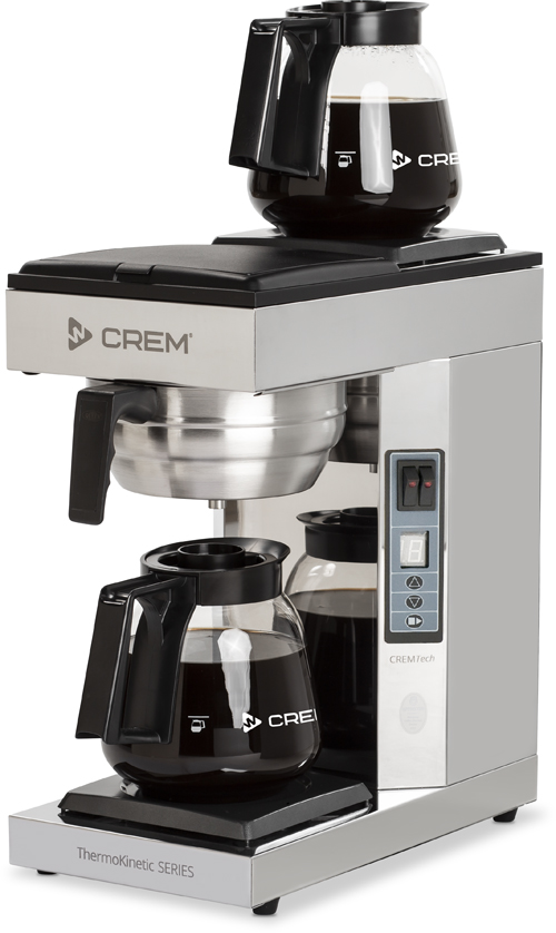 Uppskattad trotjänare med 2 värmeplattor. Bryggmängden 4-12 koppar justeras lätt. 15 liters kapacitet per timme. 2 serveringskannor på 1,8 liter vardera medföljer. Manuell vattenpåfyllning. Effekt:1-fas: 2400 W. Filter: 110 mm.