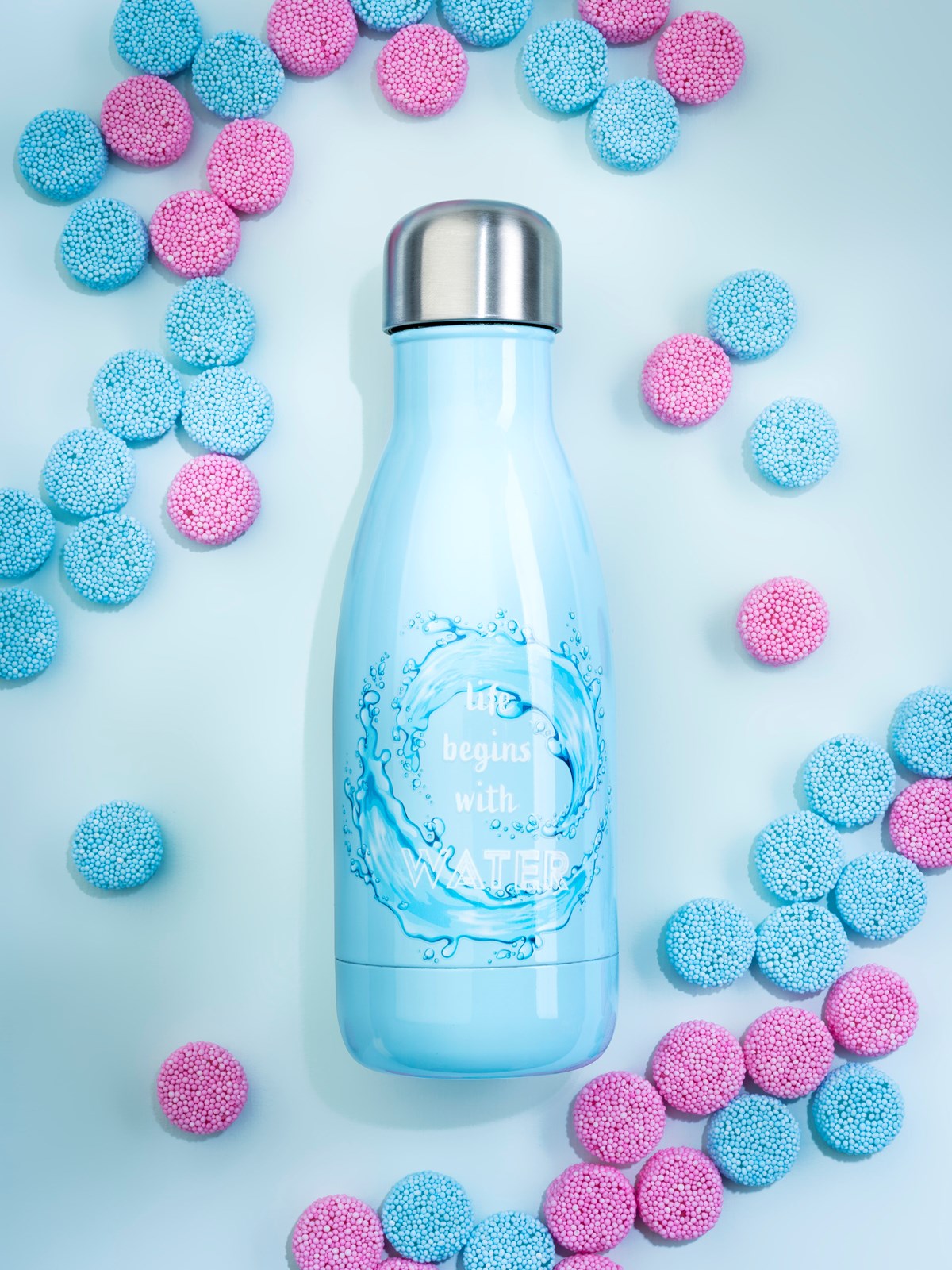 En designad vacuumisolerad vattenflaska gjord av högklassigt rostfritt stål, som håller din dryck kall upp till 24 timmar och varm upp till 12 timmar. Flaskans smala öppning är lätt att dricka ur utan onödigt spill, och passar perfekt för normalstora isbitar. Använd vattenflaskan på jobbet, hemma eller ta med till gymmet för fräscht och kallt vatten under hela dagen eller träningspasset. Mått: Ø 6 x 20 cm. Volym: 280 ml. Vikt: 0,2 kg. Material: Rostfritt stål, PP och BPA-fri silikon. Skötselråd: Handdisk.