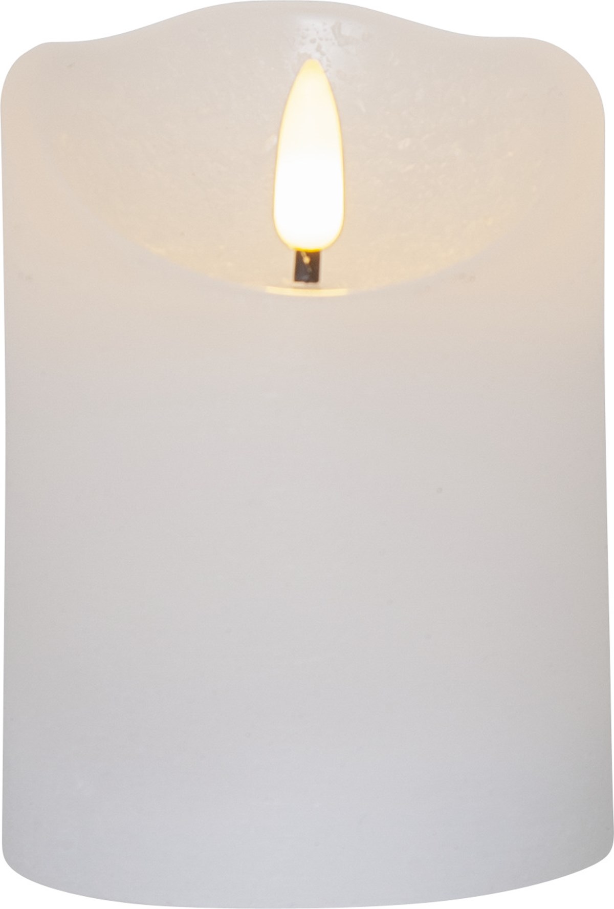 Vitt ljus av vax med rustik yta. Den naturtrogna lågan lyser med ett varmvitt sken. Med inbyggd timer, 6 h på, 18 h av, repeterande. Drivs med 2 st AA-batterier (ingår ej).