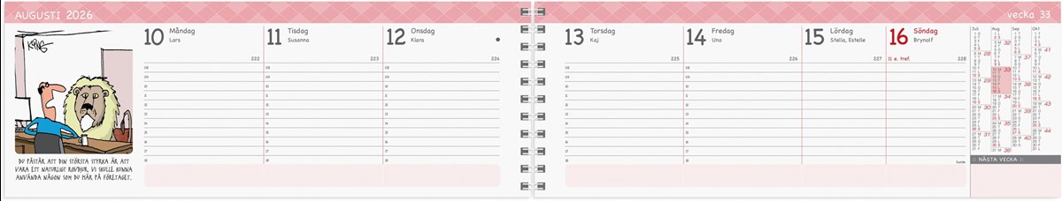 Format: 255x95 mm. Layout: Stående. Vecka/uppslag. Timindelning 8-18. Kalendarium: 2025-12-22 - 2027-01-03. Omslag: Papper. Spiralbunden. Innehåll: Kyrkliga helgdagar, Flaggdagar, Helgdagar/aftnar, Månfaser, Namnsdagar, Temadagar/händelser, Årsöversikt/årsöversikter, Årsplan/årsplaner. Antal sidor: 120. Miljöinformation: FSC®.