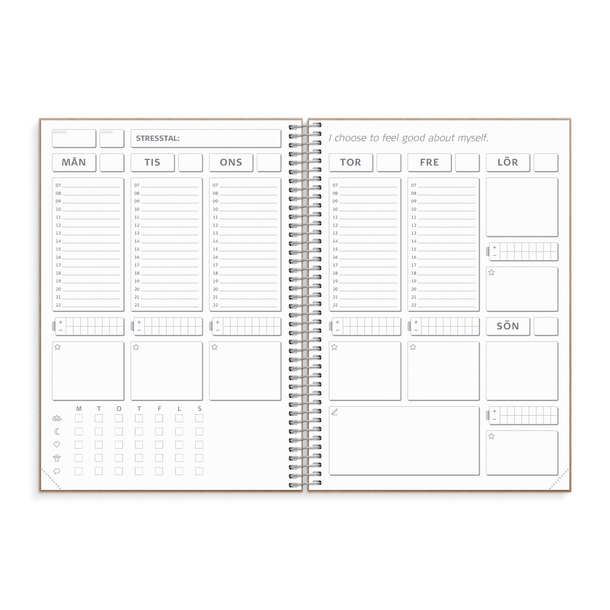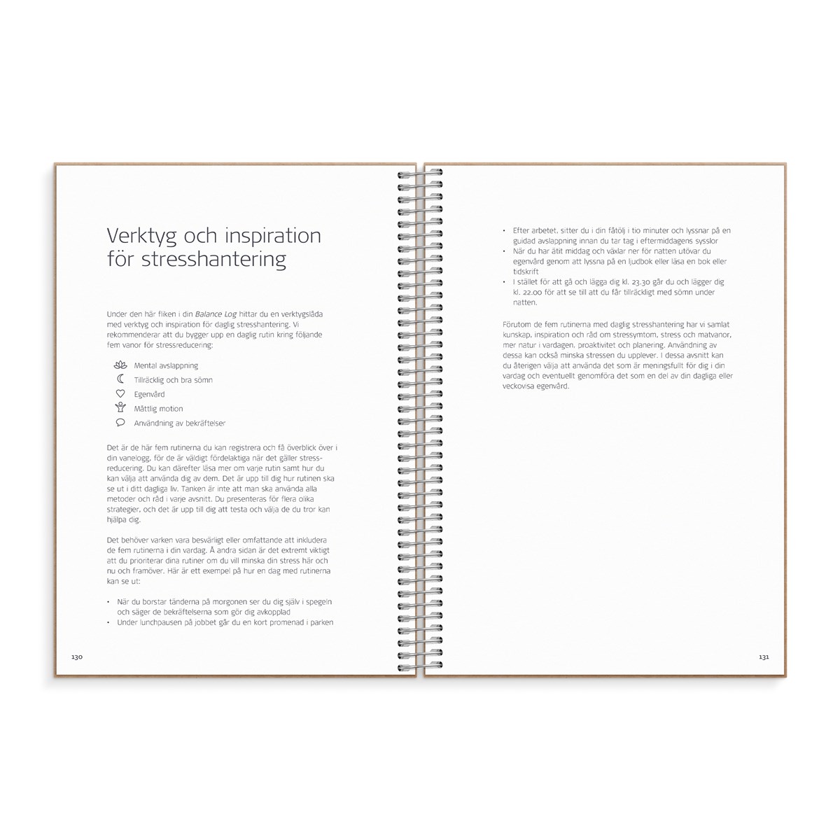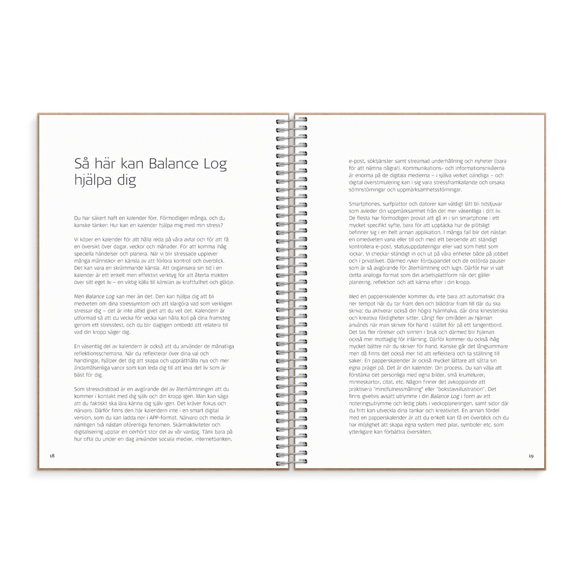 Kalenderbaserat hjälpmedel för daglig stresshantering. Innehåller 6 månaders odaterat kalendarium, månadsöversikt, sidor med verktyg och sidor för reflektion samt mycket mer relevant material. Utvecklad av professionella stresscoacher för att hjälpa dig till en vardag med mer balans och mindre stress. Balance Log är den första i sitt slag, en ban- och vanebrytande kalender, som kan vara ett utmärkt verktyg för många människor. Omslag i naturfärgad ekokartong och gummiband. Plastfickor och flyttbara flikar. Spiralbunden.