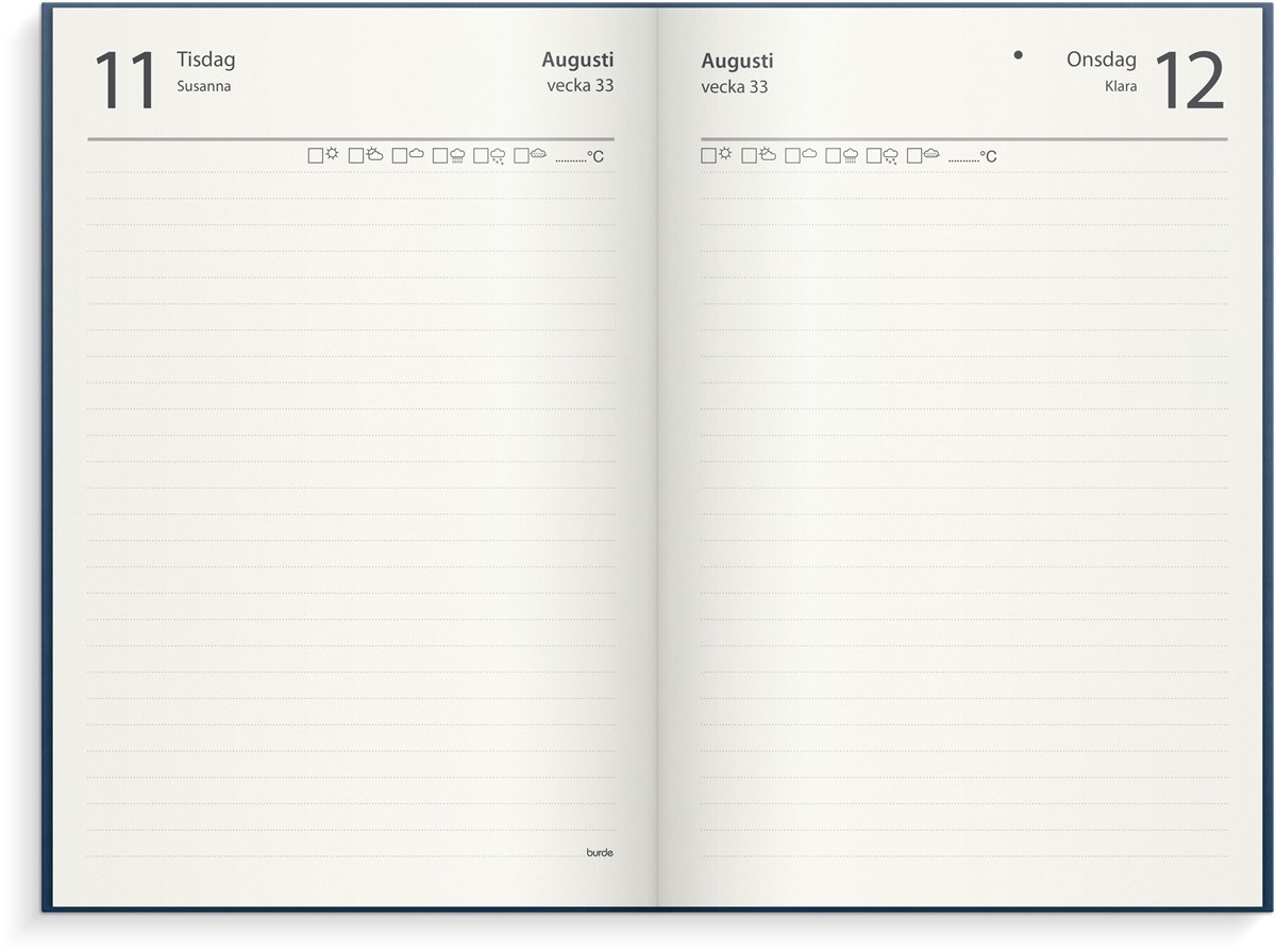 Format: 142x205 mm. Layout: Dag/sida. Kalendarium: 2026-01-01 - 2026-12-31. Omslag: Konstläder. Inbunden. Detaljer: Märkband. Innehåll: Kyrkliga helgdagar, Flaggdagar, Helgdagar/aftnar, Månfaser, Namnsdagar, Temadagar/händelser, Vädernoteringar, Årsöversikt/årsöversikter, Årsplan/årsplaner. Antal sidor: 384.