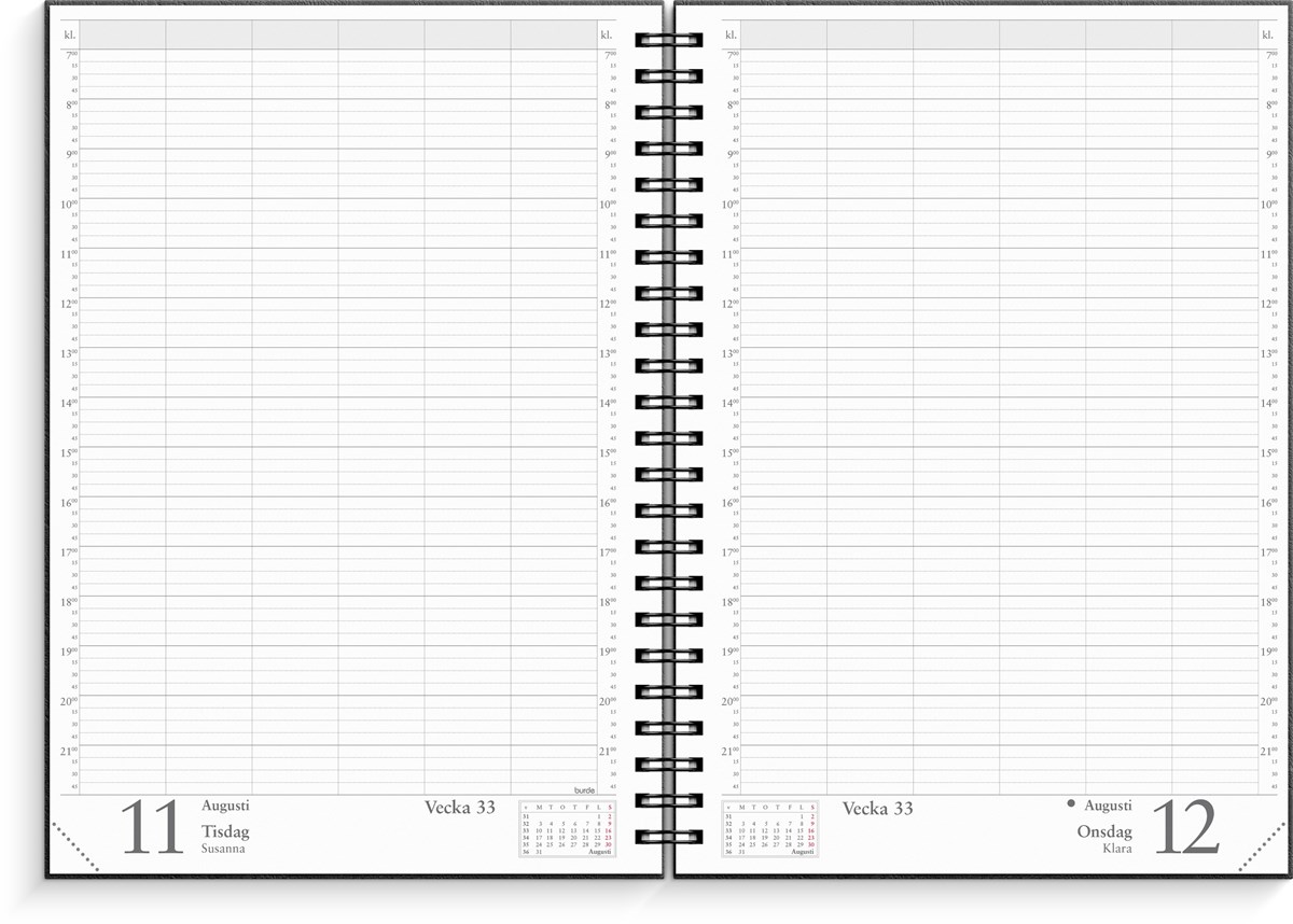 Format: A4. Layout: Dag/sida. Kvartsindelning 7-21. Kalendarium: 2026-01-01 - 2026-12-31. Omslag: Kartong. Spiralbunden. Innehåll: Kyrkliga helgdagar, Flaggdagar, Helgdagar/aftnar, Månfaser, Namnsdagar, Temadagar/händelser, Årsöversikt/årsöversikter, Årsplan/årsplaner. Antal sidor: 384. Miljöinformation: FSC®.