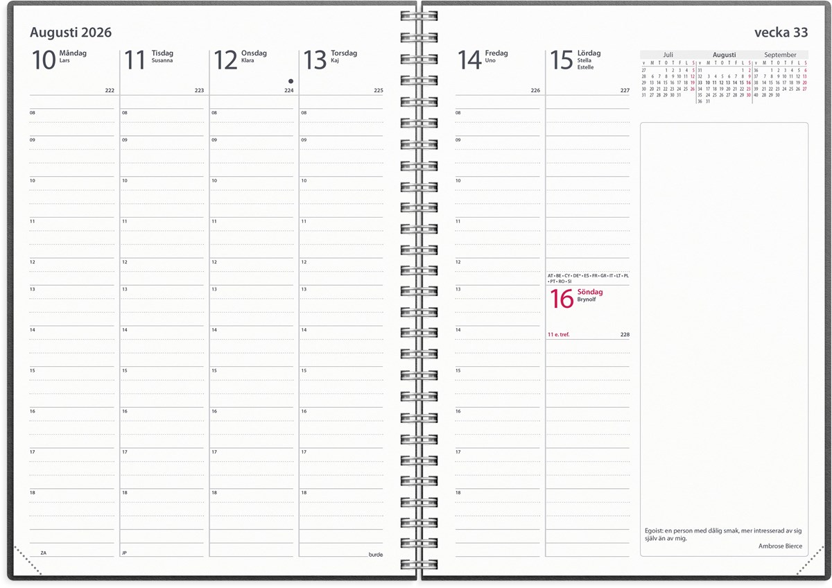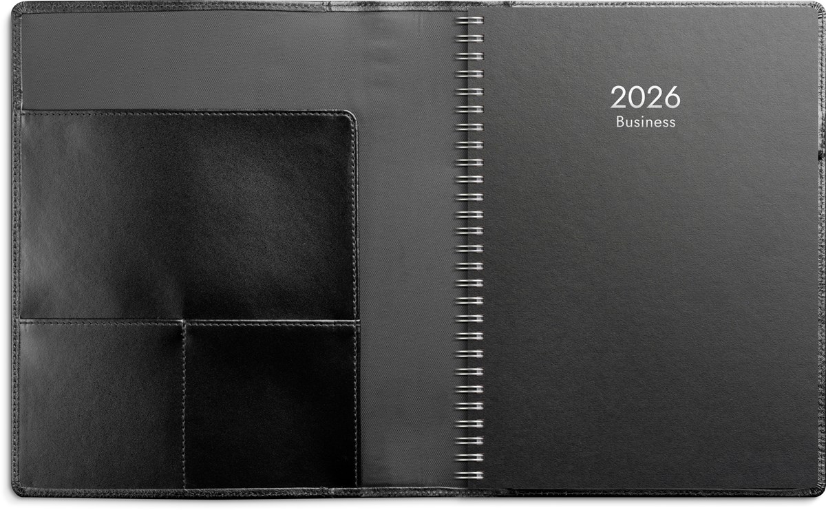 Format: A5. Layout: Stående. Vecka/uppslag. Kalendarium: 2025-11-24 - 2027-01-03. Omslag: Skinn. Spiralbunden. Innehåll: Kyrkliga helgdagar, Flaggdagar, Helgdagar/aftnar, Internationella helgdagar, Månfaser, Namnsdagar, Internationella helgdagar översikt, Temadagar/händelser, Årsöversikt/årsöversikter, Årsplan/årsplaner. Antal sidor: 144. Miljöinformation: FSC® papper.