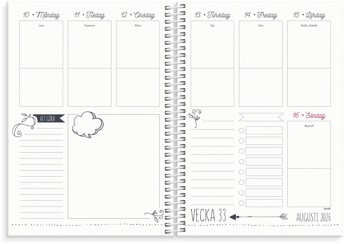 Låt din planering bli en kreativ och avkopplande paus! Det blir inspirerande att planera med din Doodle. Kalendern inleds med ett ark snygga stickers som du kan dekorera med efter känsla. Uppslagen med veckoplanering och månadsöversikt är lekfullt utformade och lämnar stort utrymme för dig att fylla med inspirerande färger, illustrationer och uppgifter. Kalendern har ett tjockare papper för att förhindra att pennor blöder igenom.