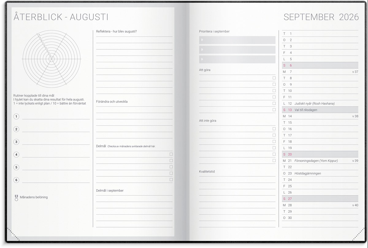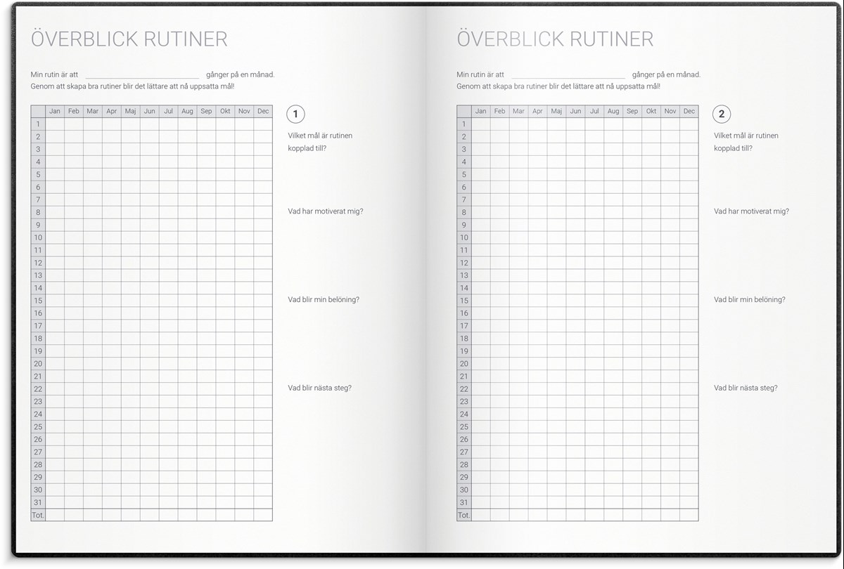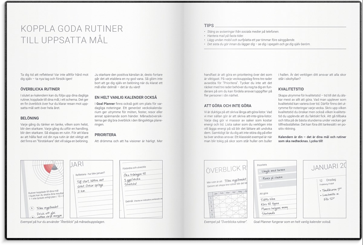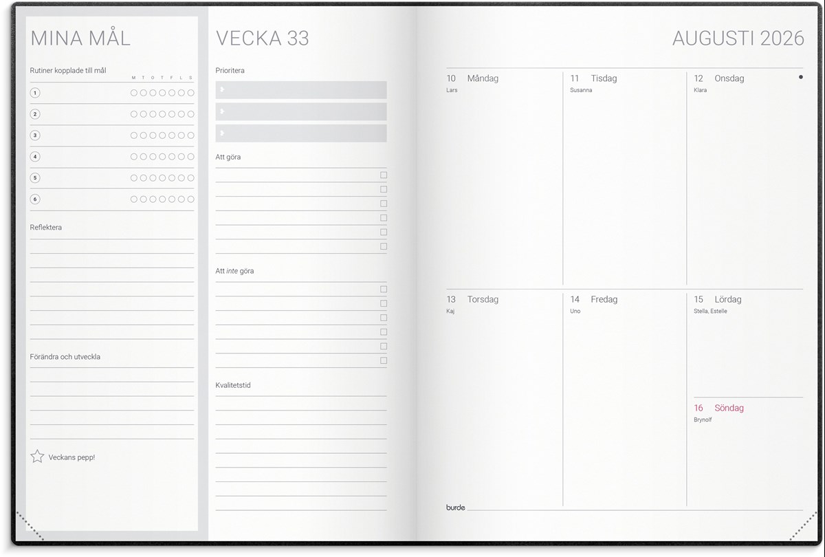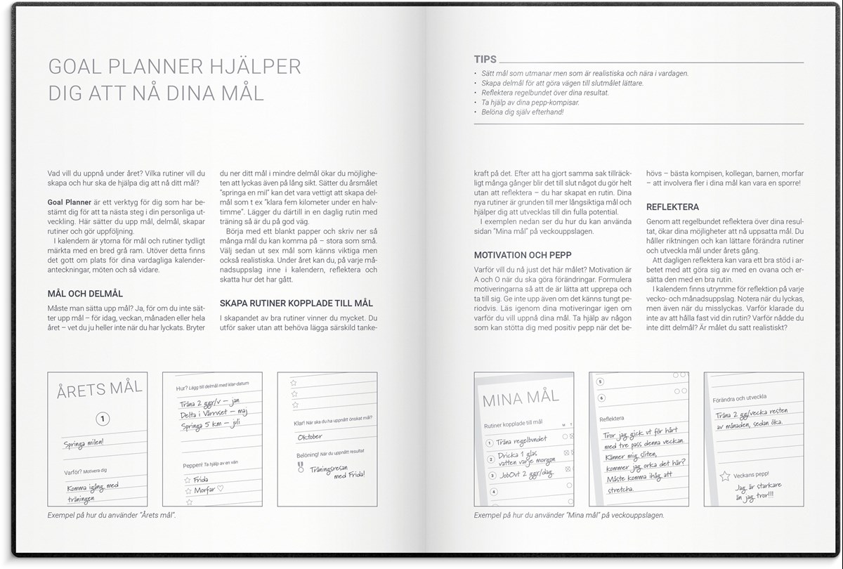 Att sätta upp mål, kämpa och slutligen lyckas är en rejäl boost för självkänslan! Oavsett vad du vill åstadkomma eller förändra är Burdes Goal Planner din optimala stöttepelare längs vägen. Du får hjälp med delmål, reflektioner, belöningar och din dagliga planering, såklart. Kalendern har ett stilrent omslag i svart konstläder med gummiband och märkband.