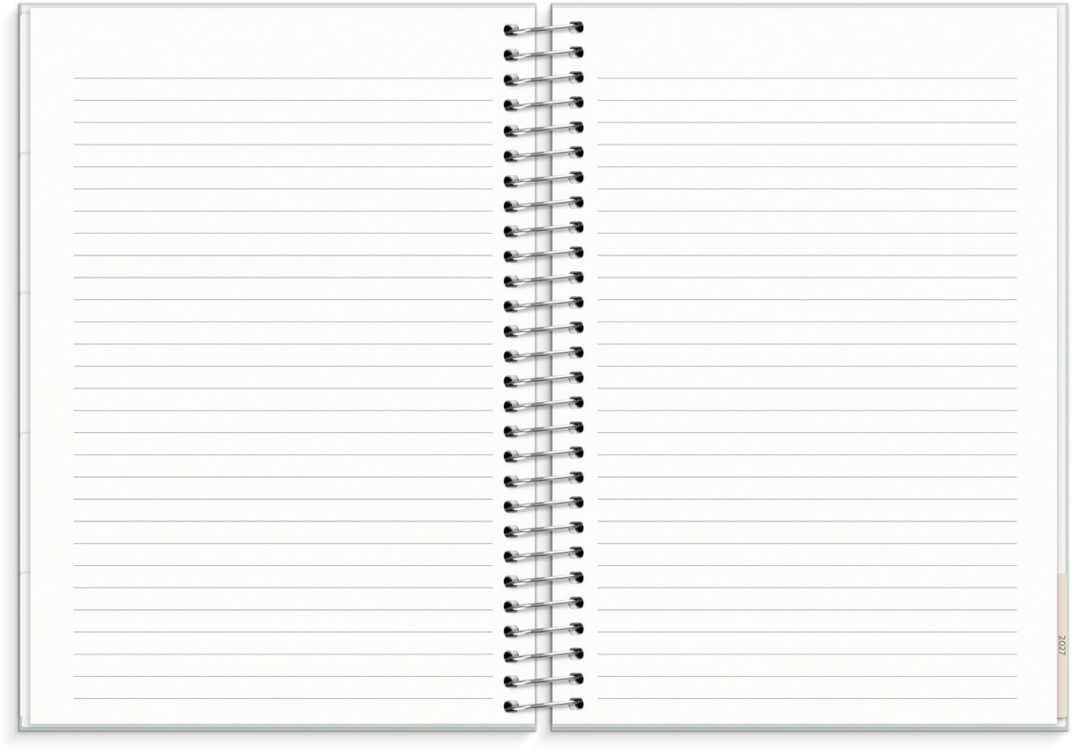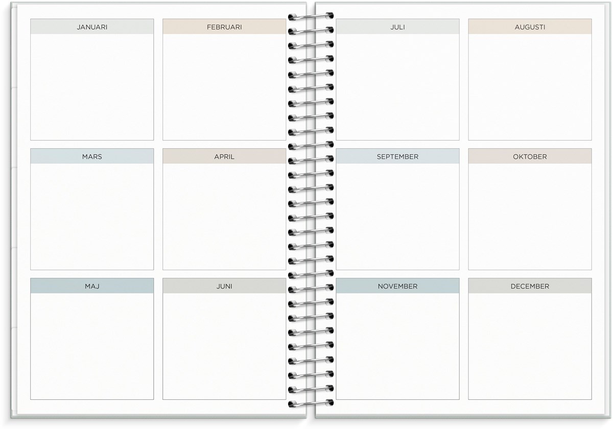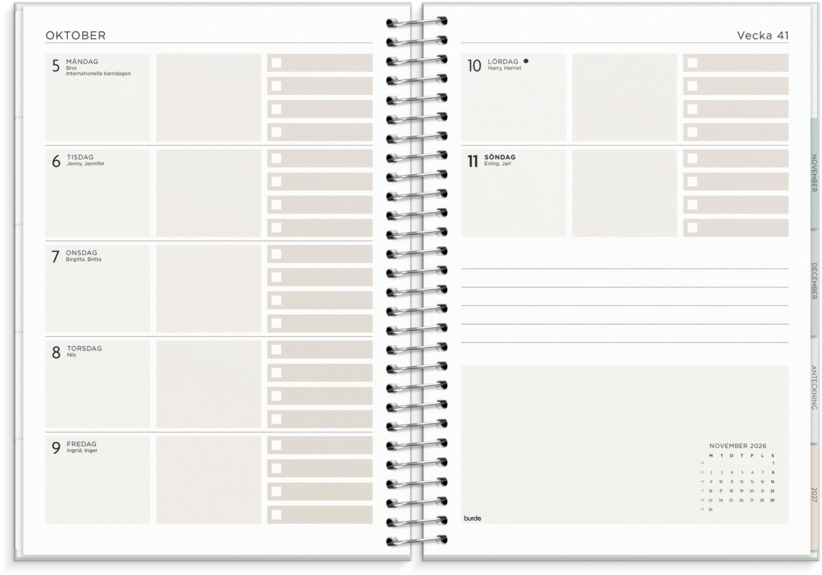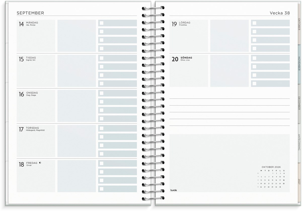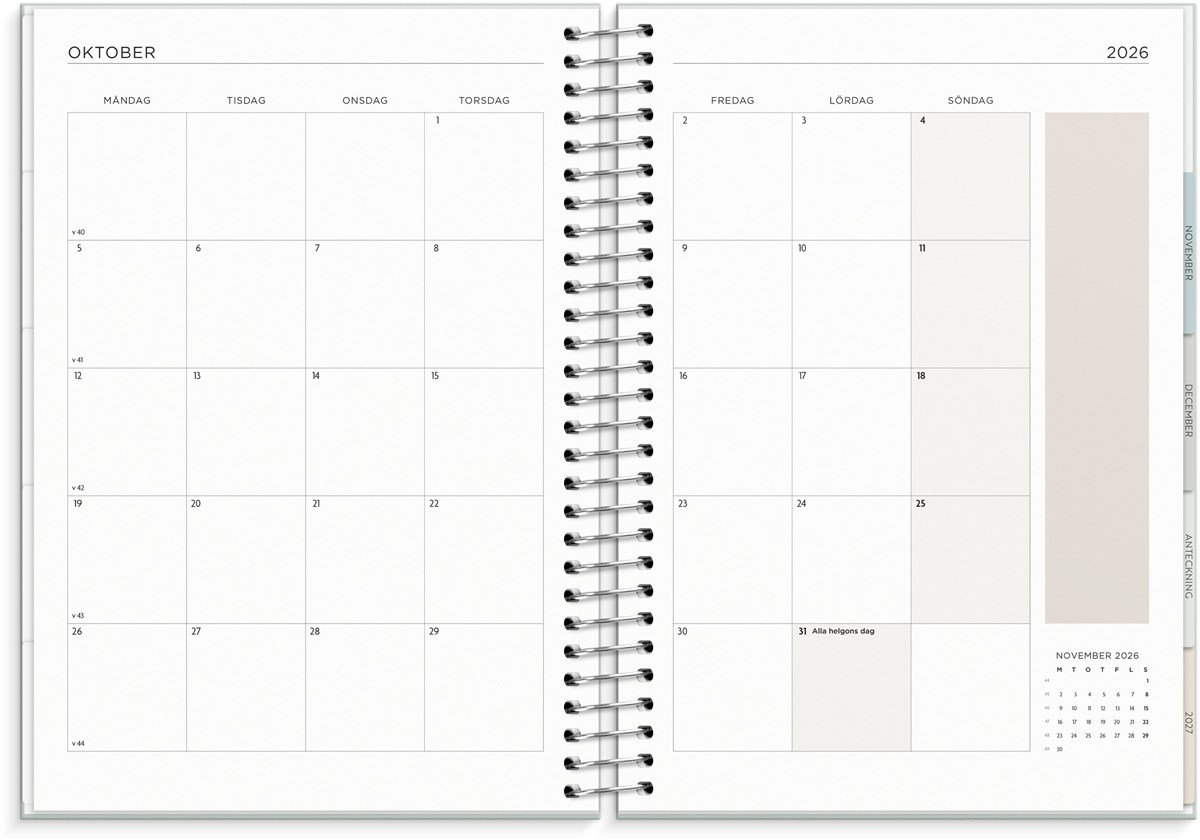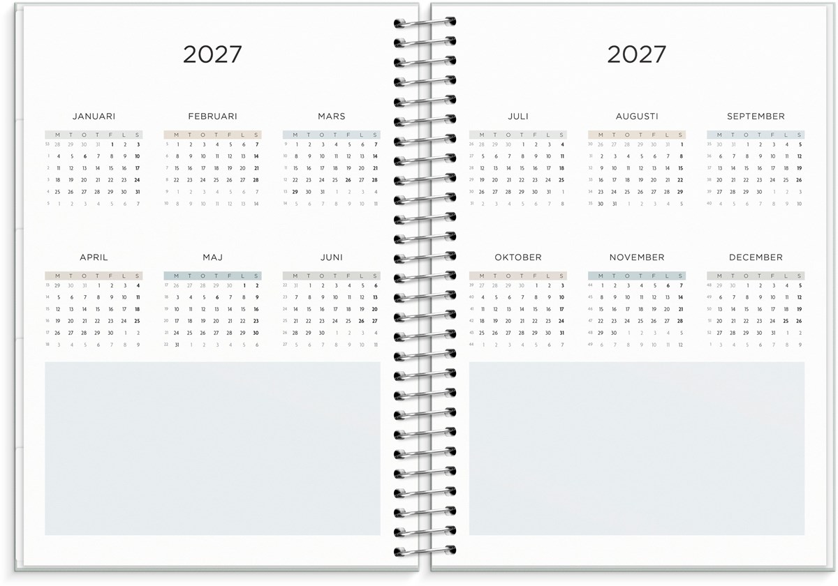 Format: C5. Layout: Liggande. Vecka/uppslag. Kalendarium: 2025-12-29 - 2027-01-03. Omslag: Kartong med struktur. Spiralbunden. Detaljer: Pappersficka. Innehåll: Flaggdagar, Helgdagar/aftnar, Månfaser, Namnsdagar, Anteckningssidor, Stickersark, Temadagar/händelser, Årsöversikt/årsöversikter, Årsplan/årsplaner. Antal sidor: 176. Miljöinformation: FSC®.