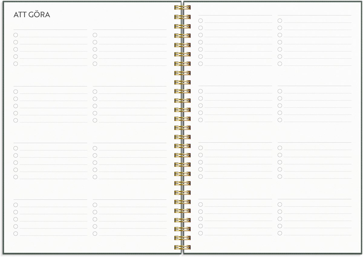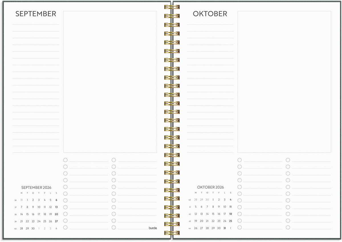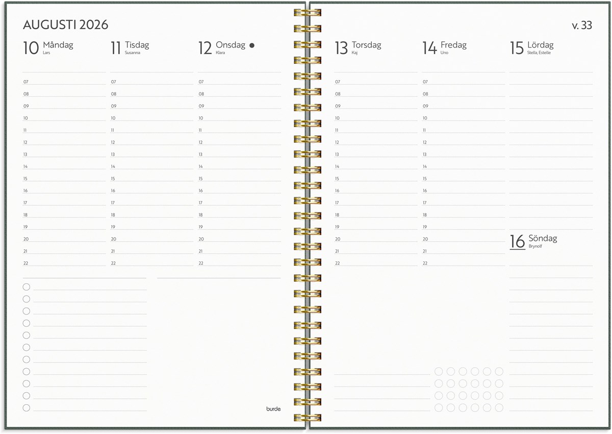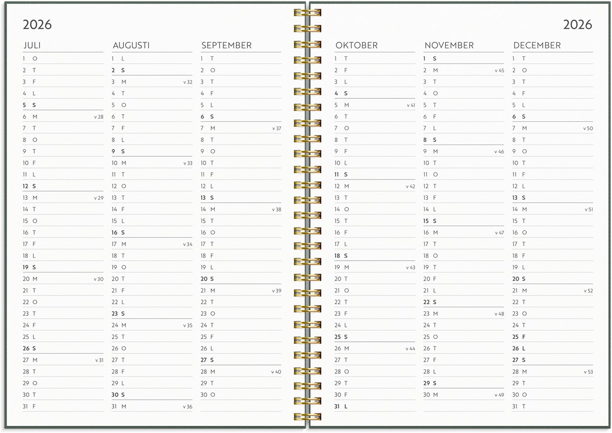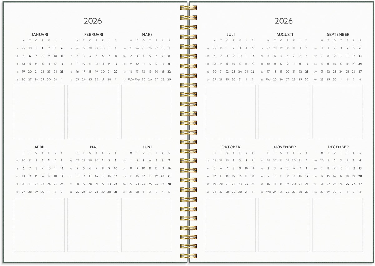 Format: A5. Layout: Stående. Vecka/uppslag. Timindelning 7-22. Kalendarium: 2025-12-15 - 2027-01-03. Omslag: Kartong med struktur. Spiralbunden. Detaljer: Gummiband. Flyttbara plastmarkörer. Pappersficka. Innehåll: Flaggdagar, Helgdagar/aftnar, Månfaser, Namnsdagar, Anteckningssidor, Temadagar/händelser, Årsöversikt/årsöversikter, Årsplan/årsplaner. Antal sidor: 160. Miljöinformation: FSC®.