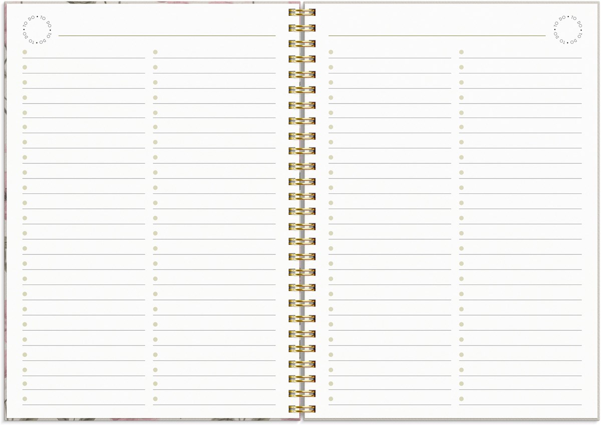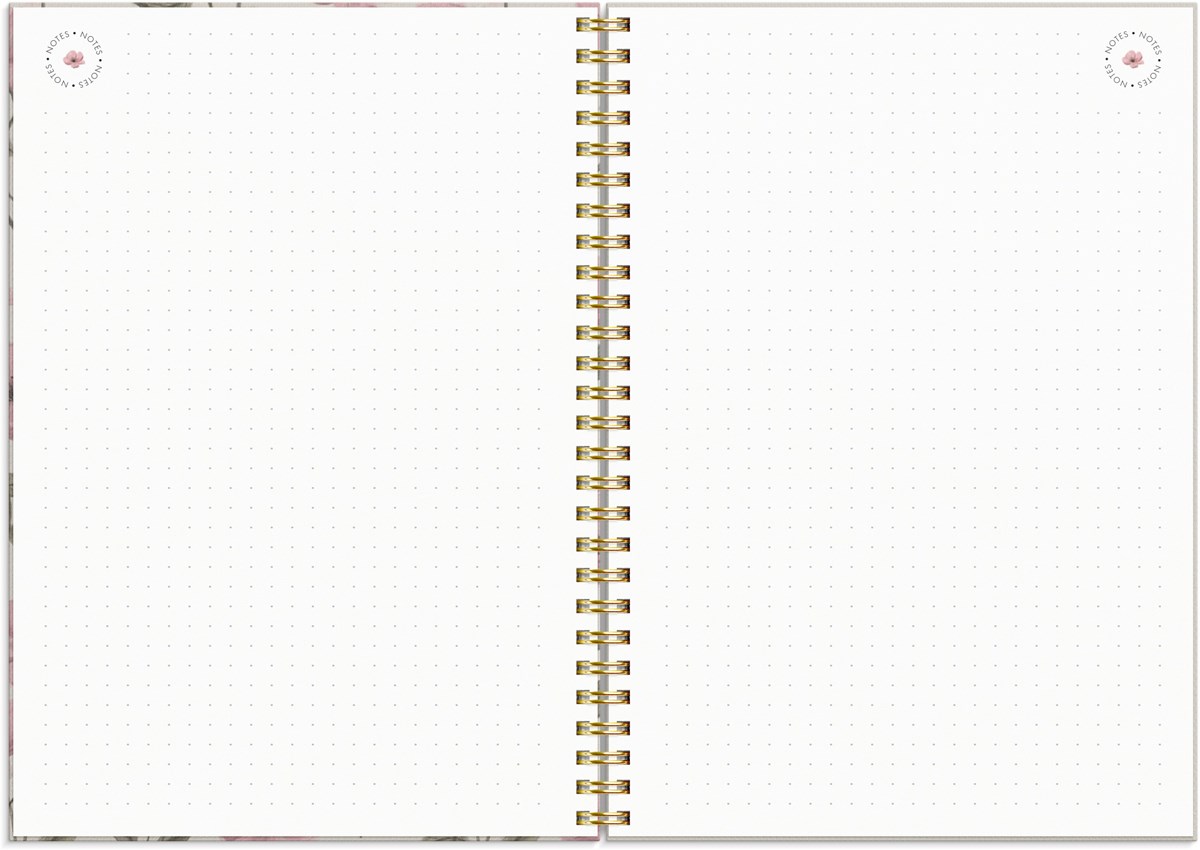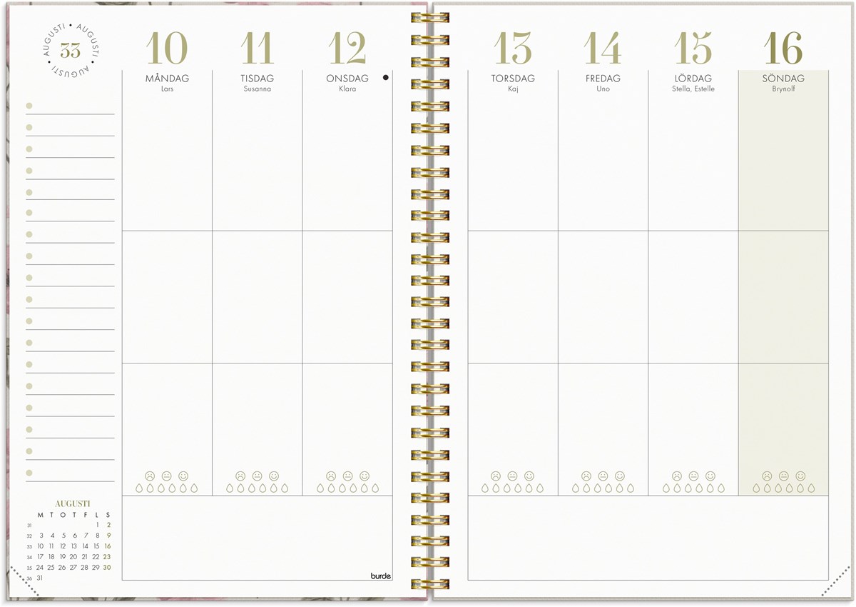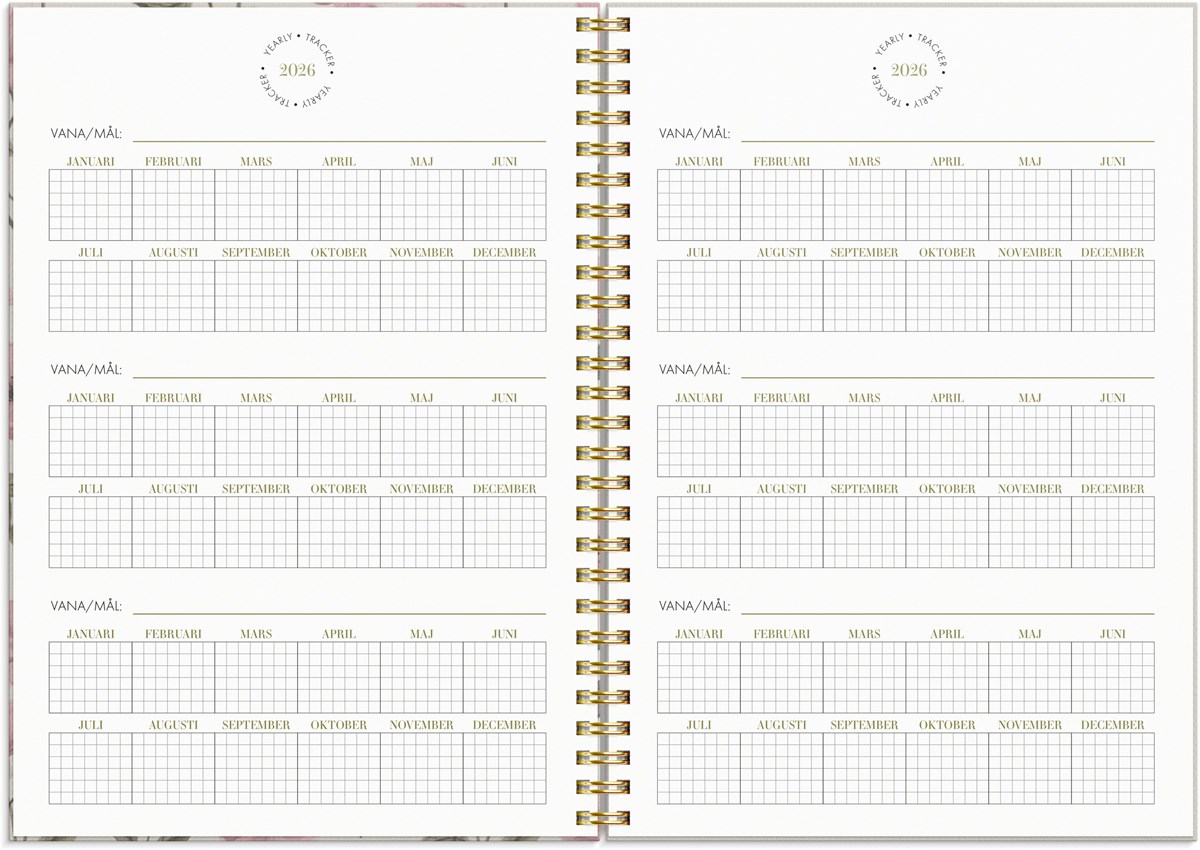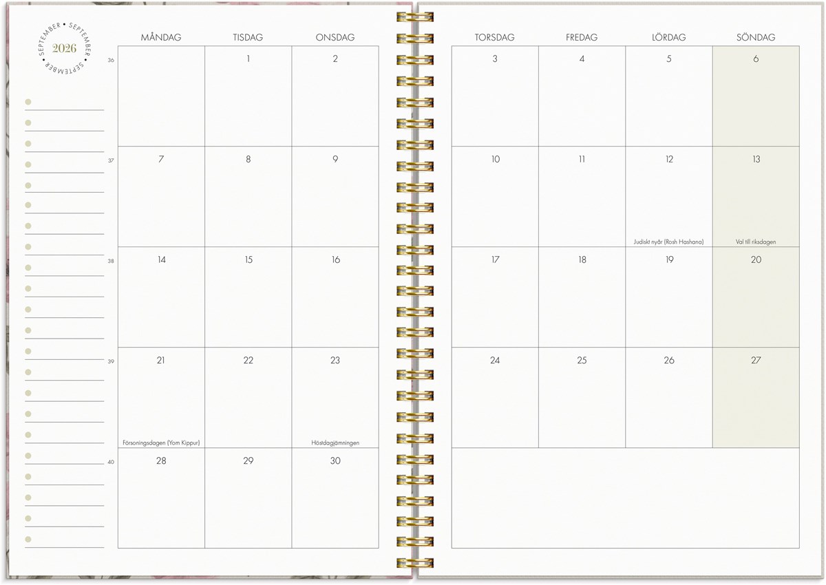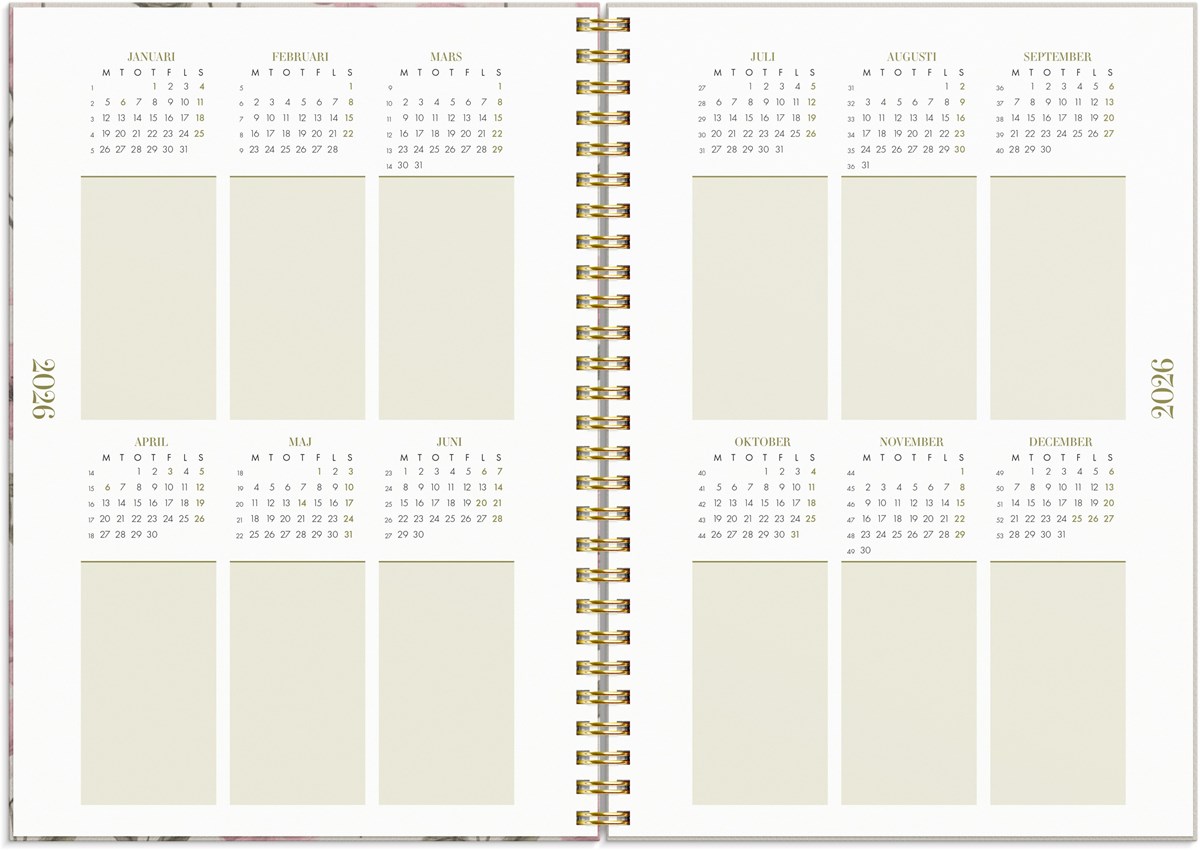 Format: A5. Layout: Stående. Vecka/uppslag. Kalendarium: 2025-12-15 - 2027-01-03. Omslag: Kartong med struktur. Spiralbunden. Detaljer: Gummiband. Flyttbar pappersmarkör. Pappersficka. Innehåll: Checklistor, Flaggdagar, Måltracker, Helgdagar/aftnar, Månadsuppslag, Månfaser, Namnsdagar, Anteckningssidor prickade, Anteckningssidor linjerade, Stickersark, Temadagar/händelser, Årsöversikt/årsöversikter. Antal sidor: 160. Miljöinformation: FSC®.
