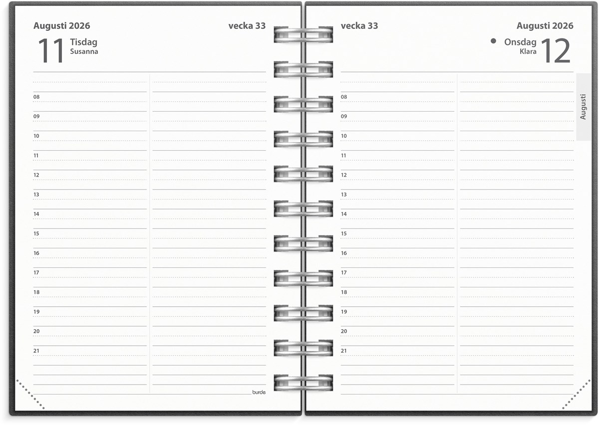 Format: A6. Layout: Dag/sida. Timindelning 8-21. Kalendarium: 2026-01-01 - 2026-12-31. Omslag: Återvunnen kartong. Spiralbunden. Innehåll: Kyrkliga helgdagar, Flaggdagar, Helgdagar/aftnar, Månfaser, Namnsdagar, Internationella helgdagar översikt, Temadagar/händelser, Årsöversikt/årsöversikter, Årsplan/årsplaner. Antal sidor: 400. Miljöinformation: FSC®. Omslag i återvunnen kartong. Tillverkad i Småland.