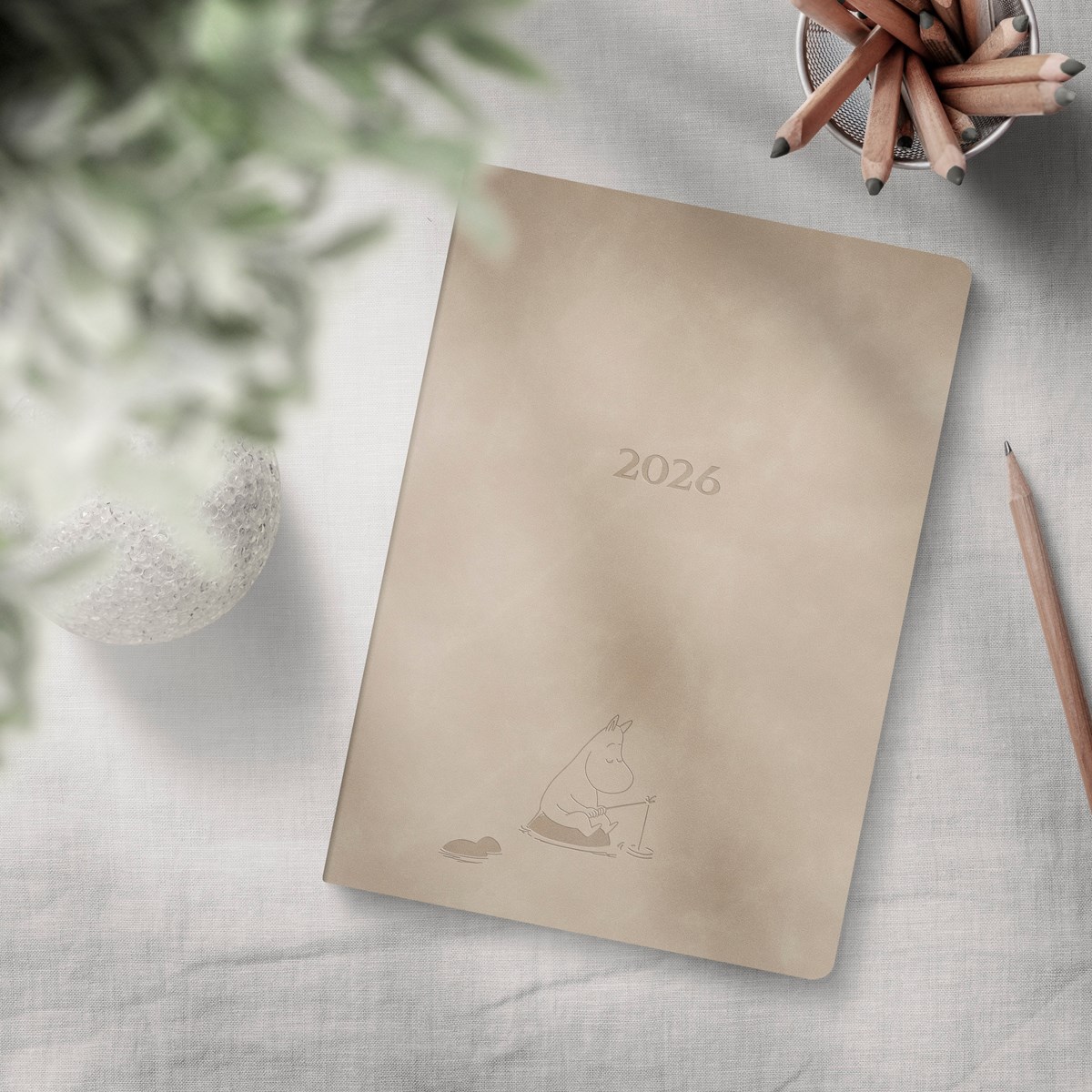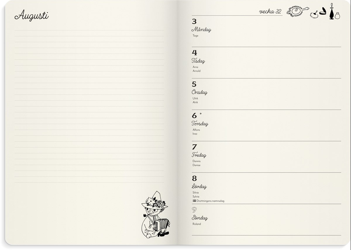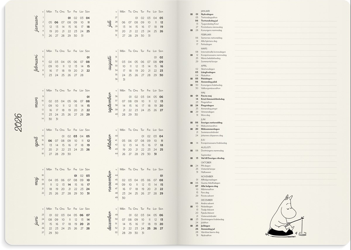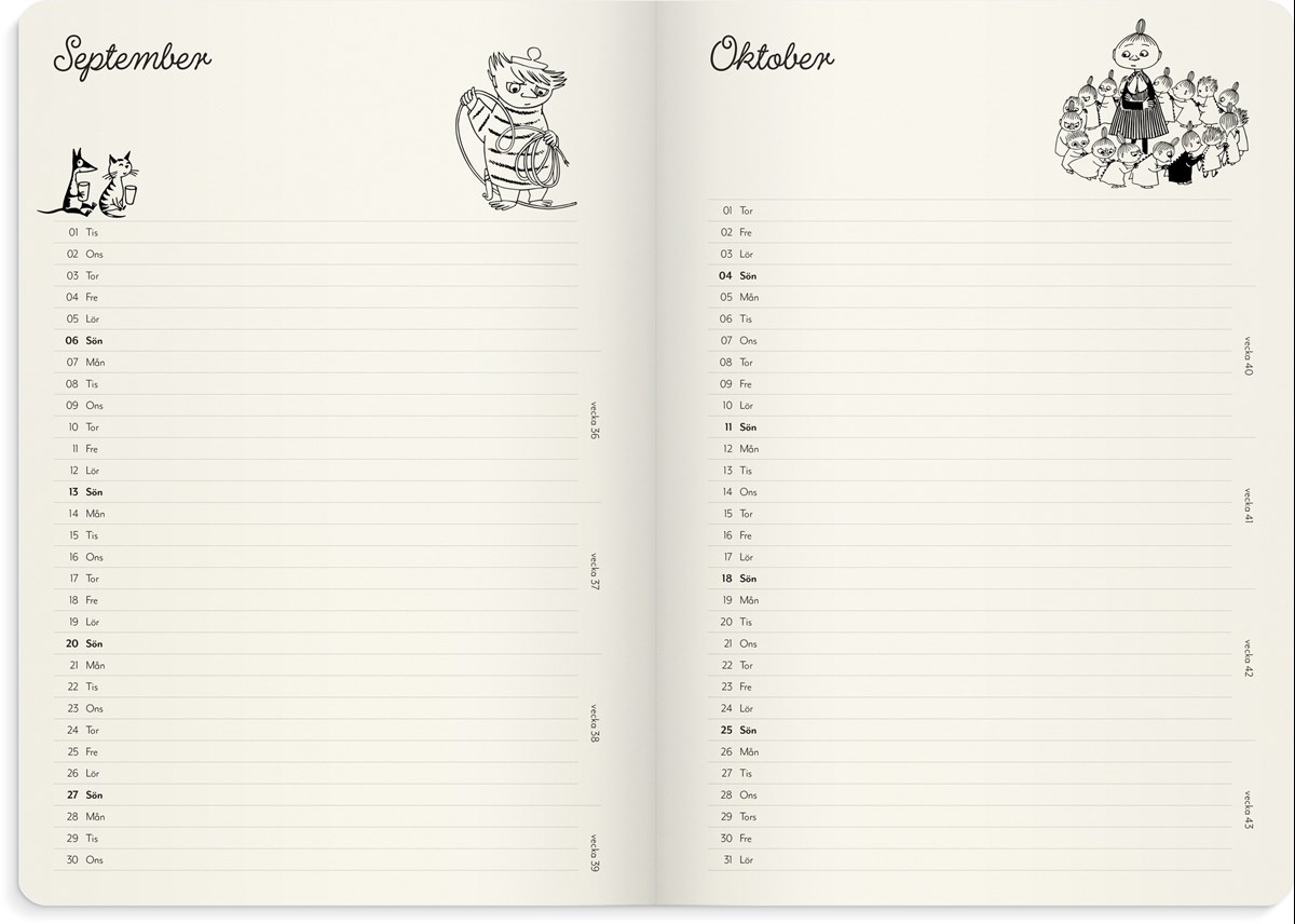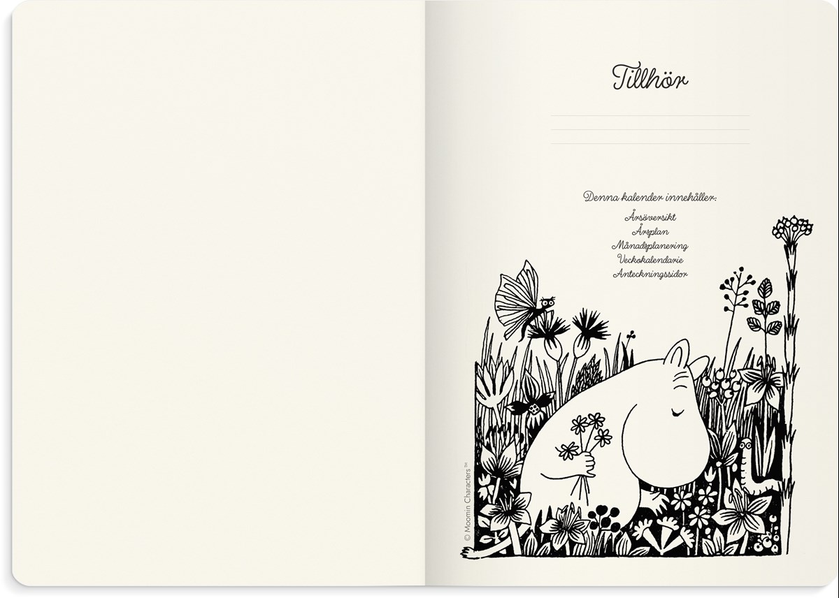 En inbunden kalender i ett sammetslent omslag i beige konstläder med ett blindpräglat Muminmotiv. Underlättar planering med fokus på livet utanför jobbet. En veckokalender med ett kalendarium för liggande planering till höger och en anteckningssida till vänster på varje uppslag. Veckouppslagen har Muminillustrationer i svartvitt. Månadsöversikter för hela året finns samlade längst fram i kalendern för överskådlig och praktisk månadsplanering. Fler anteckningssidor i slutet av kalendern ger mycket plats för noteringar.