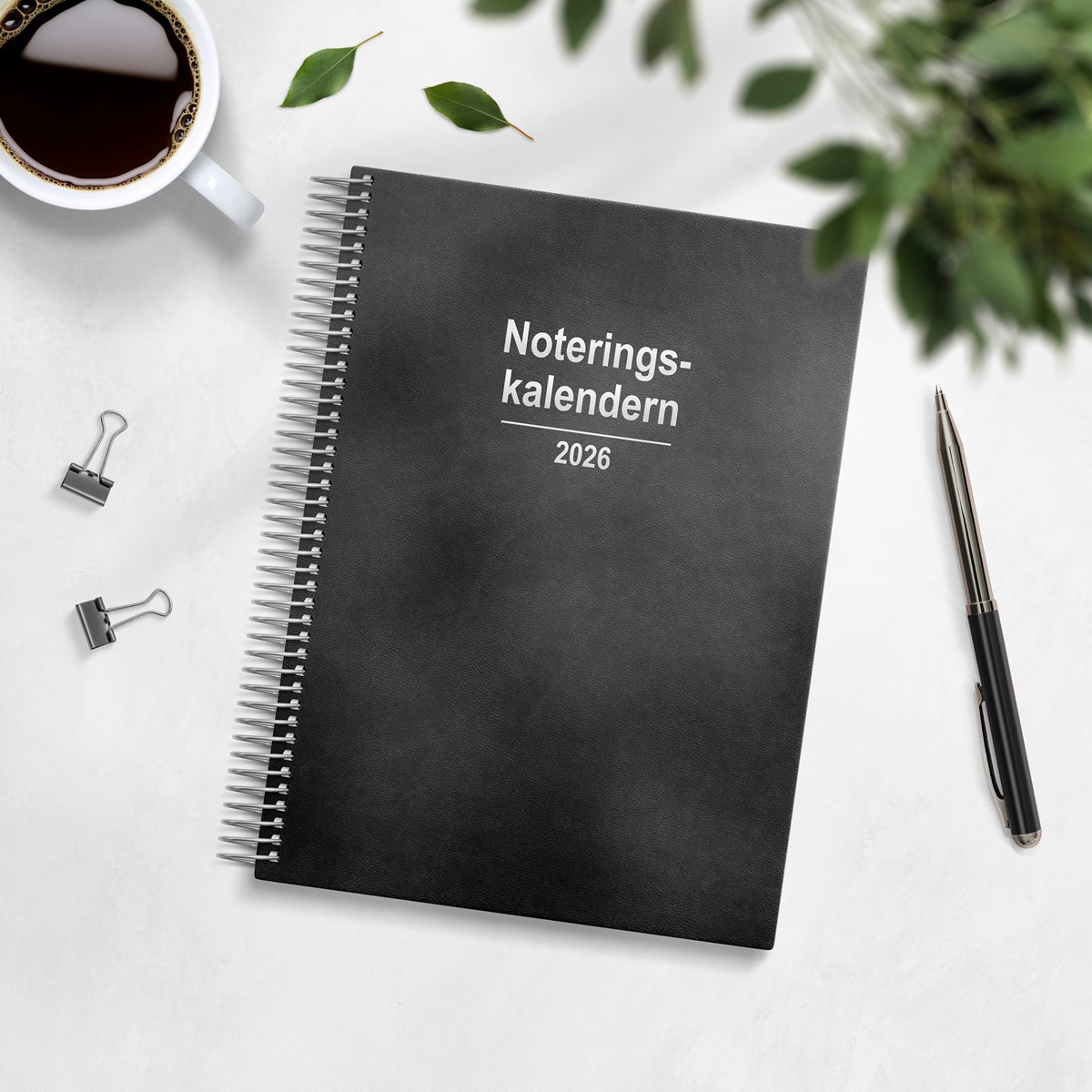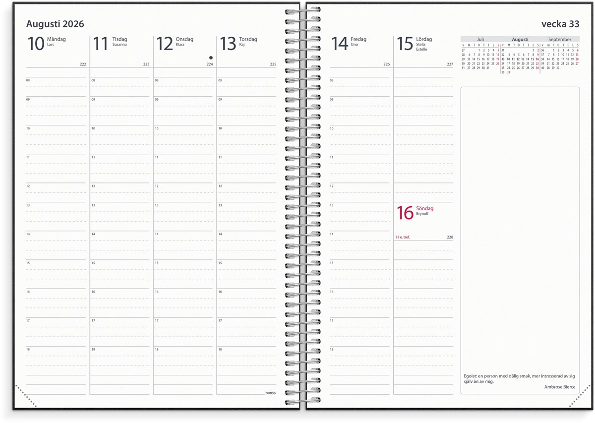 Format: A5. Layout: Stående. Vecka/uppslag. Timindelning 8-18. Kalendarium: 2025-12-22 - 2027-01-03. Omslag: Konstläder. Spiralbunden. Detaljer: Märkband. Flyttbar plastlinjal. Pappersficka. Innehåll: Kyrkliga helgdagar, Utvikbar projektplan, Flaggdagar, Helgdagar/aftnar, Månfaser, Namnsdagar, Temadagar/händelser, Årsöversikt/årsöversikter, Årsplan/årsplaner. Antal sidor: 240. Miljöinformation: FSC®.