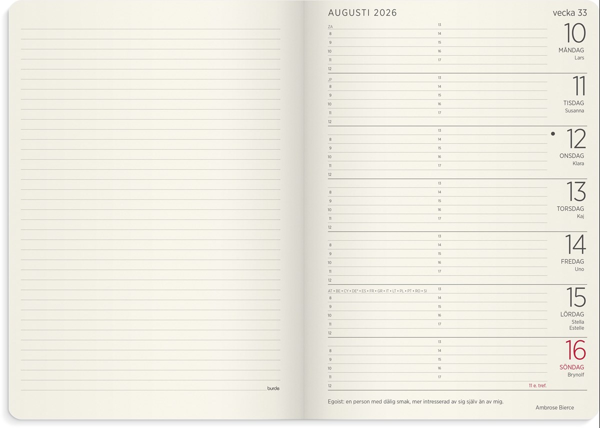 En stilren och exklusiv kalender där fokus ligger på tydlig veckoplanering. En klassisk kalender med cremefärgat papper och med en vecka per uppslag, där vänstersidan har linjerade sidor för anteckningar och högersidan timindelning 08-17. I slutet hittar du 64 extra sidor för anteckningar och en lättöverskådlig årsplanering. Enkelt och tydligt med fokus på det viktigaste!