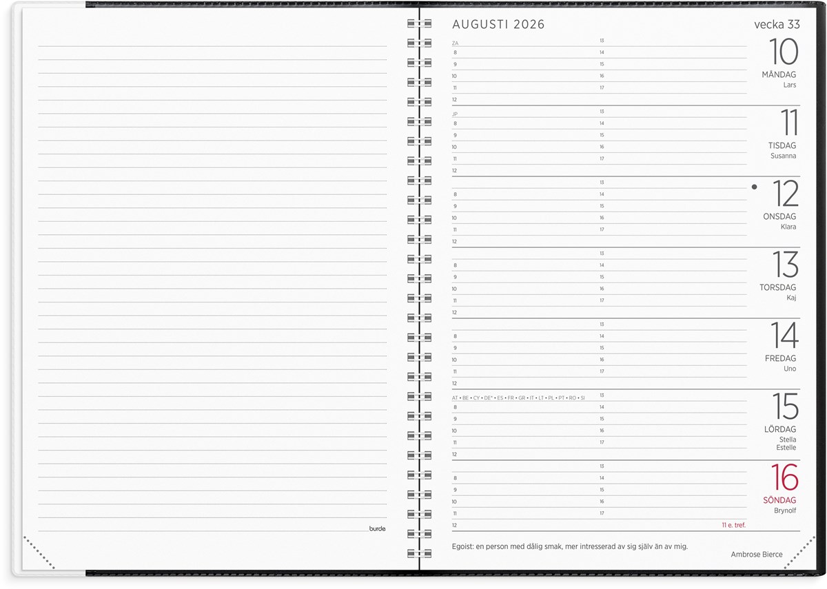 Format: A5. Layout: Liggande. Vecka/uppslag. Timindelning 8-17. Kalendarium: 2025-12-22 - 2027-01-03. Omslag: Plast. Spiralbunden. Innehåll: Kyrkliga helgdagar, Flaggdagar, Helgdagar/aftnar, Internationella helgdagar, Linjerade vänstersidor, Månfaser, Namnsdagar, Internationella helgdagar översikt, Löst telefonblad, Temadagar/händelser, Årsöversikt/årsöversikter, Årsplan/årsplaner. Antal sidor: 112. Miljöinformation: FSC®.