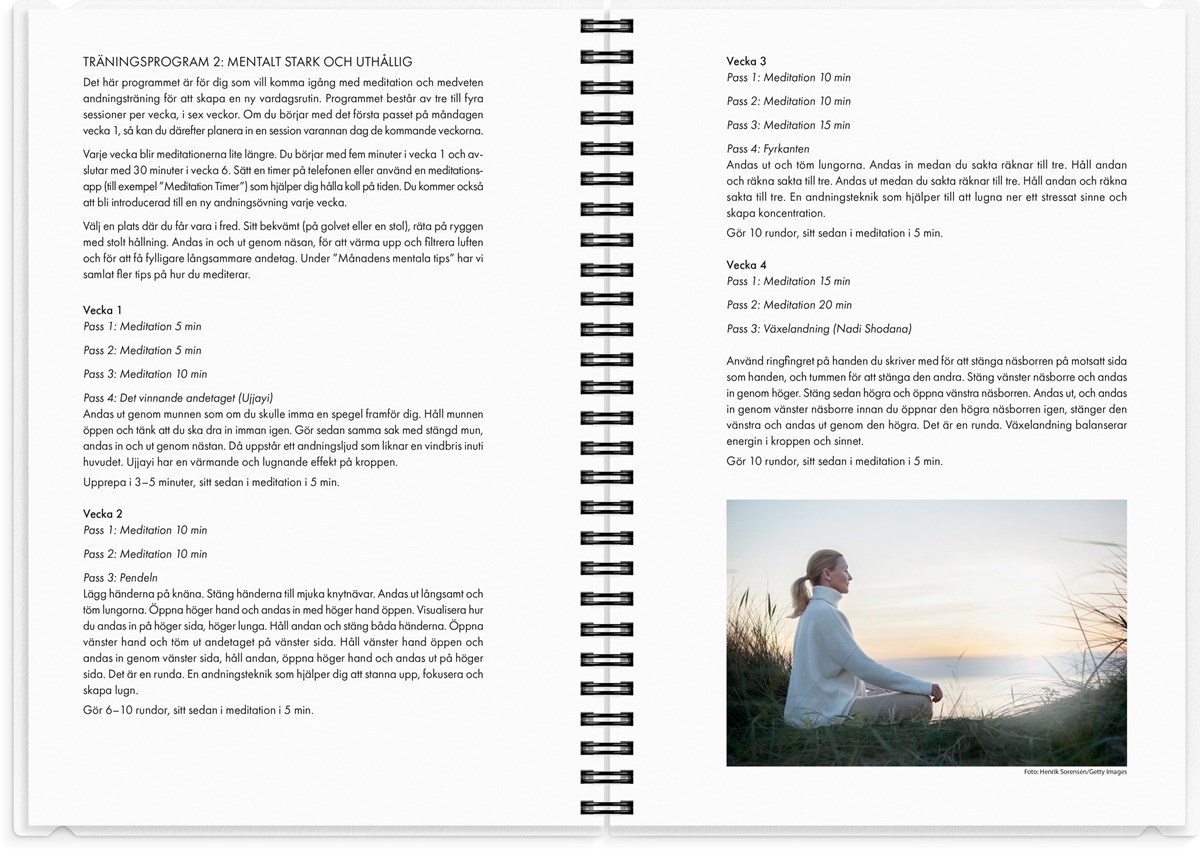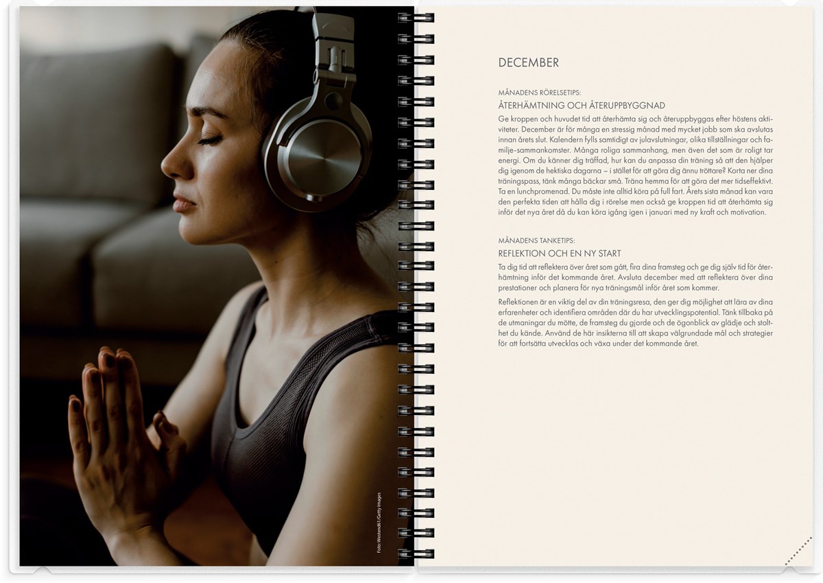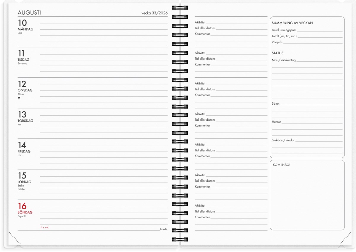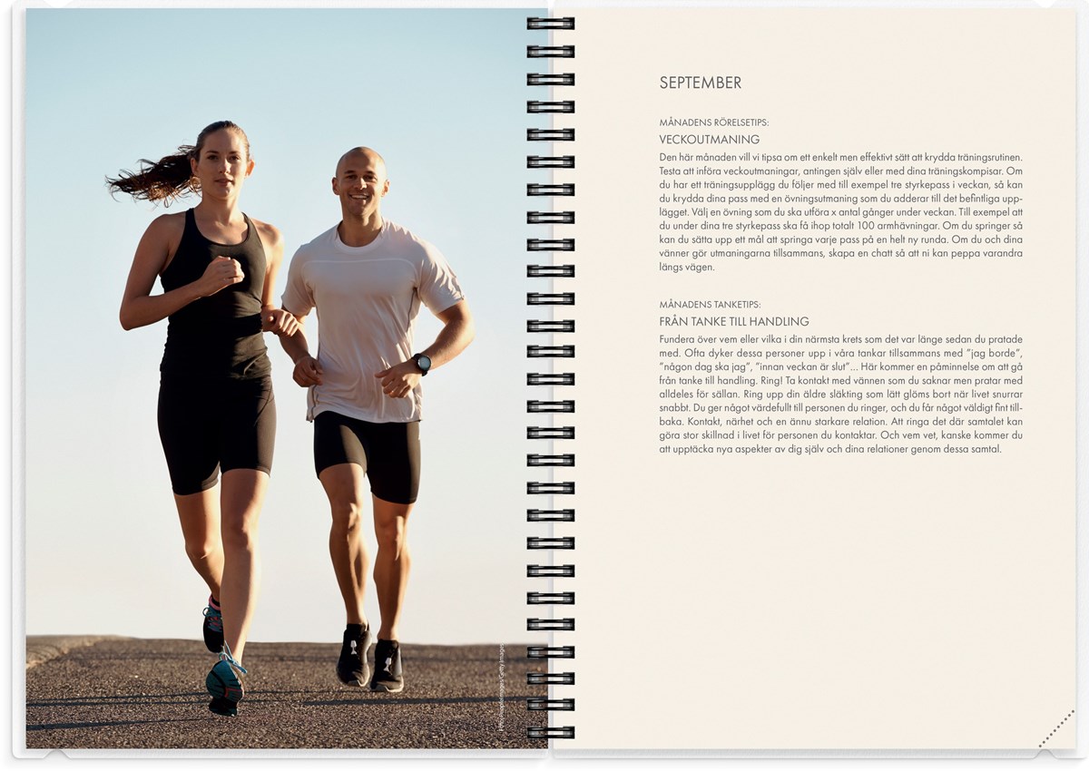 Träningskalendern hjälper dig att få sunda vanor i din vardag, men även att behålla dem över tid. Kalendern passar dig som vill ha en allsidig träning med en kombination av löpning och styrketräning. Det ingår även ett program för dig som vill komma i gång med meditation och andningsövningar så att den mentala träningen blir en naturlig del av din vardag också. Båda programmen är signerade löpcoachen och PT:n Jenny Sunding. Jenny ger också hälsosamma tips som håller inspirationen vid liv hela året. På varje uppslag finns dels en kalendersida med veckoplanering och dels en aktivitetssida. Träningskalendern har ett funktionellt plastomslag för att kunna följa med dig på träningspassen och även 2 framsidor att växla mellan.