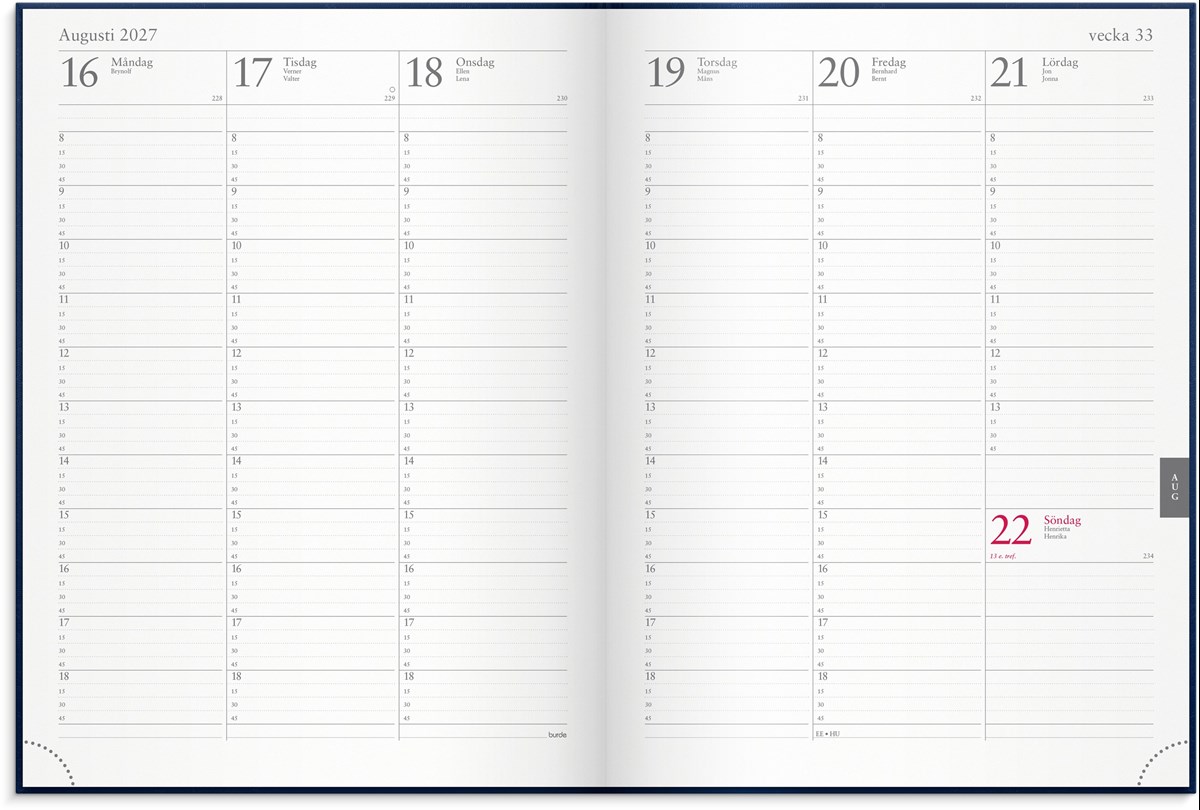 Format: 195x260 mm. Layout: Stående. Vecka/uppslag. Kvartsindelning 8-19. Kalendarium: 2025-12-29 - 2027-01-03. Omslag: Konstläder. Inbunden. Detaljer: Märkband. Innehåll: Kyrkliga helgdagar, Flaggdagar, Helgdagar/aftnar, Internationella helgdagar, Månfaser, Namnsdagar, Internationella helgdagar översikt, Temadagar/händelser, Årsöversikt/årsöversikter, Årsplan/årsplaner. Antal sidor: 112. Miljöinformation: FSC®.