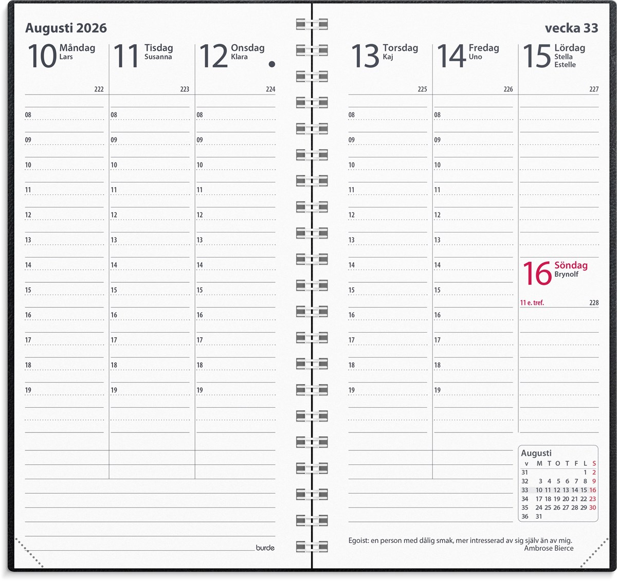 Format: 83x158 mm. Layout: Stående. Vecka/uppslag. Timindelning 8-19. Kalendarium: 2025-09-15 - 2027-03-14. Omslag: Skinn. Spiralbunden. Innehåll: Atlas, Kyrkliga helgdagar, Flaggdagar, Helgdagar/aftnar, Månfaser, Namnsdagar, Internationella helgdagar översikt, Telefonregister, Temadagar/händelser, Årsöversikt/årsöversikter, Årsplan/årsplaner. Antal sidor: 160. Miljöinformation: FSC®.