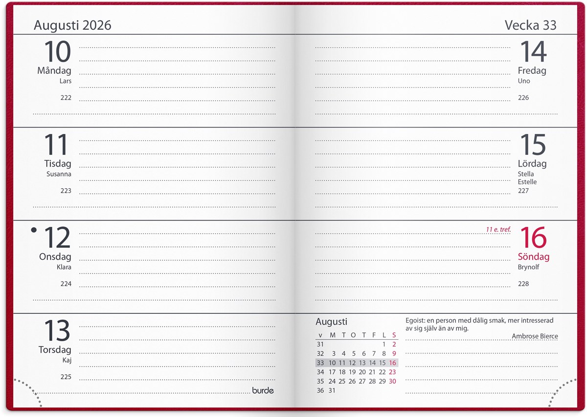 Format: 70x100 mm. Layout: Liggande. Vecka/uppslag. Kalendarium: 2025-12-22 - 2027-01-03. Omslag: Konstläder. Inbunden. Innehåll: Atlas, Kyrkliga helgdagar, Flaggdagar, Helgdagar/aftnar, Månfaser, Namnsdagar, Internationella helgdagar översikt, Telefonregister, Temadagar/händelser, Årsöversikt/årsöversikter, Årsplan/årsplaner. Antal sidor: 192. Miljöinformation: FSC® papper.
