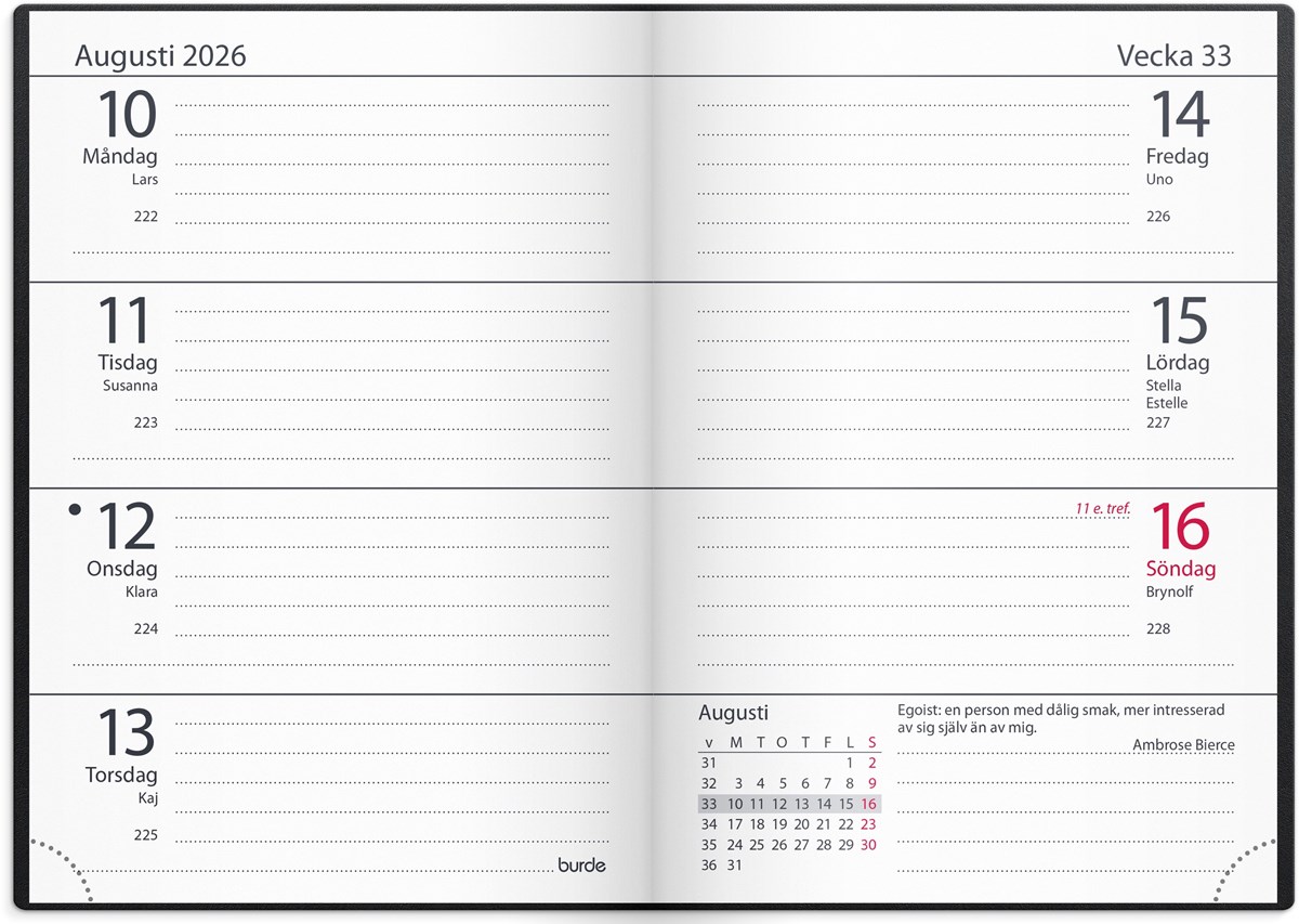 Format: 70x100 mm. Layout: Liggande. Vecka/uppslag. Kalendarium: 2025-12-22 - 2027-01-03. Omslag: Plast. Inbunden. Innehåll: Atlas, Kyrkliga helgdagar, Flaggdagar, Helgdagar/aftnar, Månfaser, Namnsdagar, Internationella helgdagar översikt, Telefonregister, Temadagar/händelser, Årsöversikt/årsöversikter, Årsplan/årsplaner. Antal sidor: 192. Miljöinformation: FSC®.