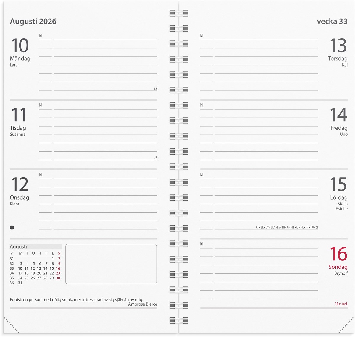 Format: 83x158 mm. Layout: Liggande. Vecka/uppslag. Kalendarium: 2025-12-08 - 2027-01-03. Omslag: Kartong. Spiralbunden. Innehåll: Kyrkliga helgdagar, Flaggdagar, Helgdagar/aftnar, Internationella helgdagar, Månfaser, Namnsdagar, Internationella helgdagar översikt, Temadagar/händelser, Årsöversikt/årsöversikter, Årsplan/årsplaner. Antal sidor: 128. Miljöinformation: FSC®.